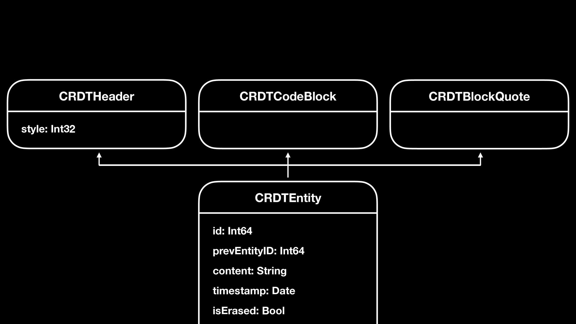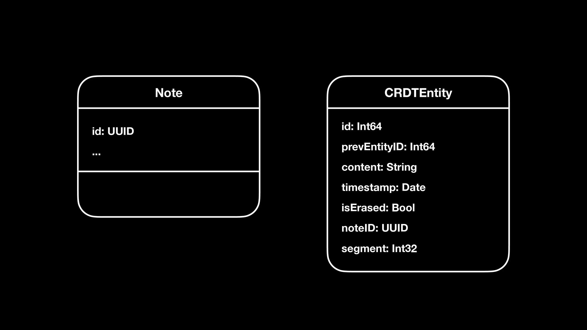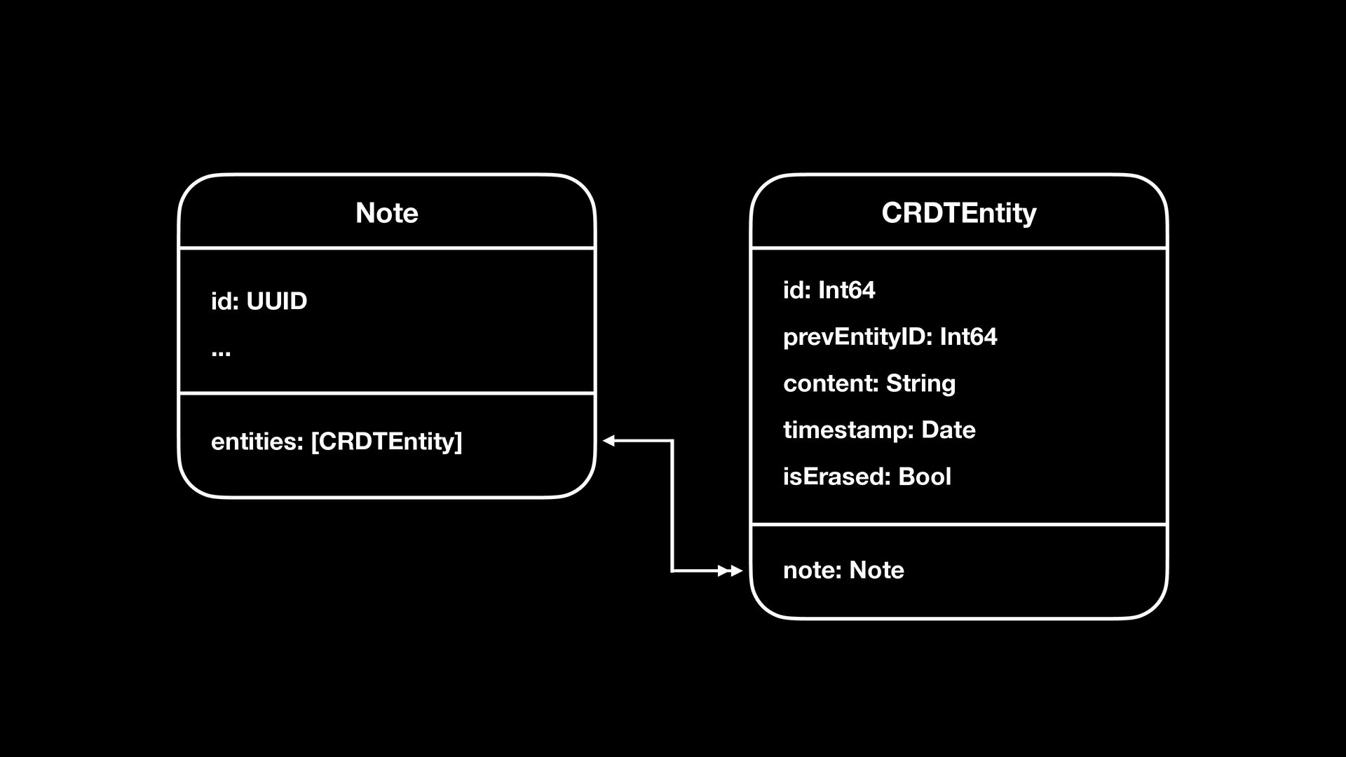 CRDTEntity id: Int64 prevEntityID: Int64 content: String timestamp: Date isErased: