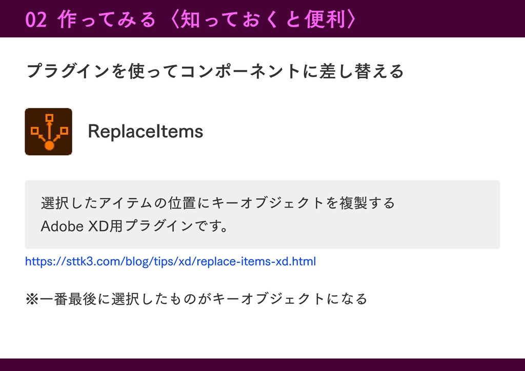 以下補足のようなもの▼ スライドの中で紹介した『ReplaceItems』をリリースしている 『したたか企画』さんは、かゆいところに手が届くようなプラグインを 他にもリリースされているので、 ご興味ある方は是非調べてみてください。