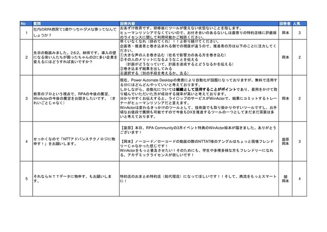 義がなんとも言えませんので、回答に苦慮しますが…。規模の大小・業種業界問わず、弊社を パートナーとして位置づけご活用頂けているユーザー様にとっては弊社をご評価いただけてい るような気がしております。弊社の支援スタンスが「現場に寄り添って支援する」ということ を大切にしておりますので、RPAで内製化を進めたいユーザー様にとっては、弊社をご利用頂 きやすいのではないかと考えております。ライセンスを提供する業者、所謂、ディストリ ビューターのような位置づけで考えて頂きますと、お役立ちできる範囲が限られてしまうよう に感じます。 0 14 たまいさんが何とかさんだったのかー!教えるの 上手いな。マジで。 どなたか存じませんが、ありがとうございます。この一言が励みになります! 蓑原 1 15 特約店としてのライバル企業は?なーんて聞いて みちゃっても答えてくれちゃったりする? 同業と申し上げますと恐れ多いですが、人材サービス業の会社様ですと近しいようなビジネス モデル・サービス内容かと考えておりますので、どこの企業様とは申し上げにくいのですが、 人材サービス関連の企業様です。 岡本 2 16 バージョンアップとかIEからの切り替えとかが怖 いよぉぉぉぉぉ!助けて! 弊社もエンドユーザー様から同様のお声を頂くこともございます。弊社または弊社に関わら ず、お付き合いのある特約店様から随時最新情報を取得頂き、対応方法を協議頂きご対応頂く ことが最善かと存じます。ご相談先がない場合は弊社にお声がけください。また、バージョン アップなどで、不具合・改善要望が出た場合は、即座に開発元様にエスカレーションさせて頂 きますので、併せてご相談いただければと存じます。 岡本 2 17 日本一詳しいんですか、それならマジで色々教え てくださいよ、前に落ちた経験あるので、、、 会の冒頭で申し上げましたが、検定試験の準備としましては、まずは、試験問題をよく読み問 題の意図をしっかりと理解されてから解答に臨んでいただければと存じます。また、試験の実 施方法や実施環境が都度変更される可能性がありますので、予め、試験の応募内容を確認頂い た上でご応募頂き、試験に臨んで頂くことをお勧めいたします。試験問題に対しての準備とし ましては、現在市販されております検定試験の過去問題や、関連する研修が開催されておりま すので、ご購入・ご参加頂くことをご検討いただければと存じます。 岡本 0 18 過去問最新版ほしいですー! 検定試験主催会社様と協議の上、検討したいと考えております。 岡本 1 19 ヒューマンリソシアさんは各地の地銀さんと提携 して銀行さんの顧客向けのRPA提案をやっている と伺いましたが、具体的にどんなことをやってい るのでしょうか。 ご質問頂いた内容でご認識に相違ございません。地方銀行様のお客様向けにWinActorのご利用 を地方銀行様とご一緒にご提案させて頂いております。詳細は弊社のプレスリリースに記載が ございますので、各地方銀行様との業務提携のプレスリリースをご参照いただければと存じま す。 岡本 1 20 サブシナリオってバージョンアップでの互換性と かどうなんでしょう? サブシナリオはテンプレートのシナリオなので、そこから推察すると、6.3.1からの互換性が厳 しいものと考えます。 ▼参考サイト https://winactor.com/questions/question/ver6%e3%81%a7%e4%bd%9c%e6%88%90%e3%81% 97%e3%81%9f%e3%82%b7%e3%83%8a%e3%83%aa%e3%82%aa%e3%82%92ver6%e3%81 %a7%e5%ae%9f%e8%a1%8c%e3%81%99%e3%82%8b%e3%81%a8%e3%82%a8%e3%83% a9%e3%83%bc%e3%81%ab%e3%81%aa/ 蓑原 0