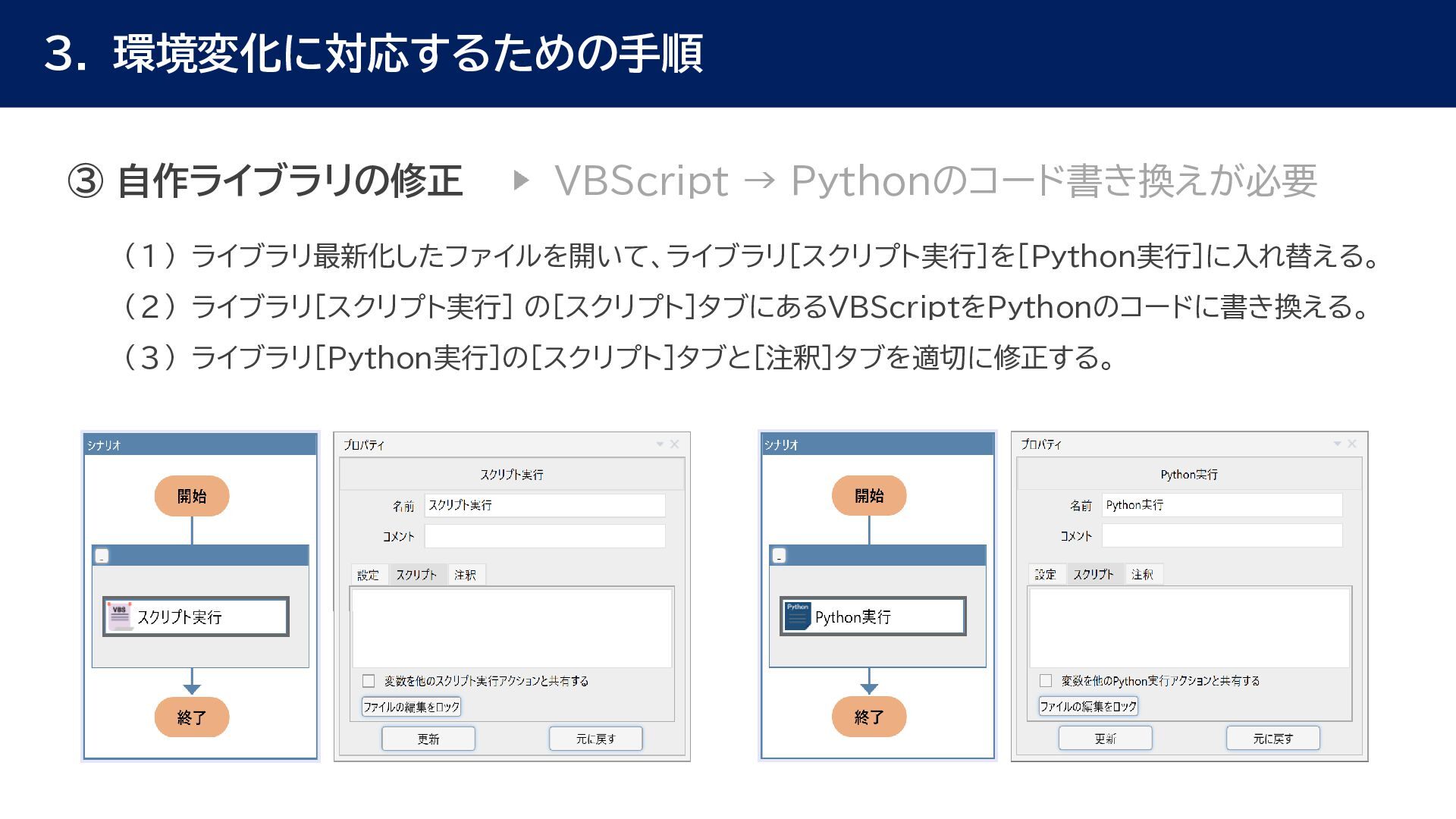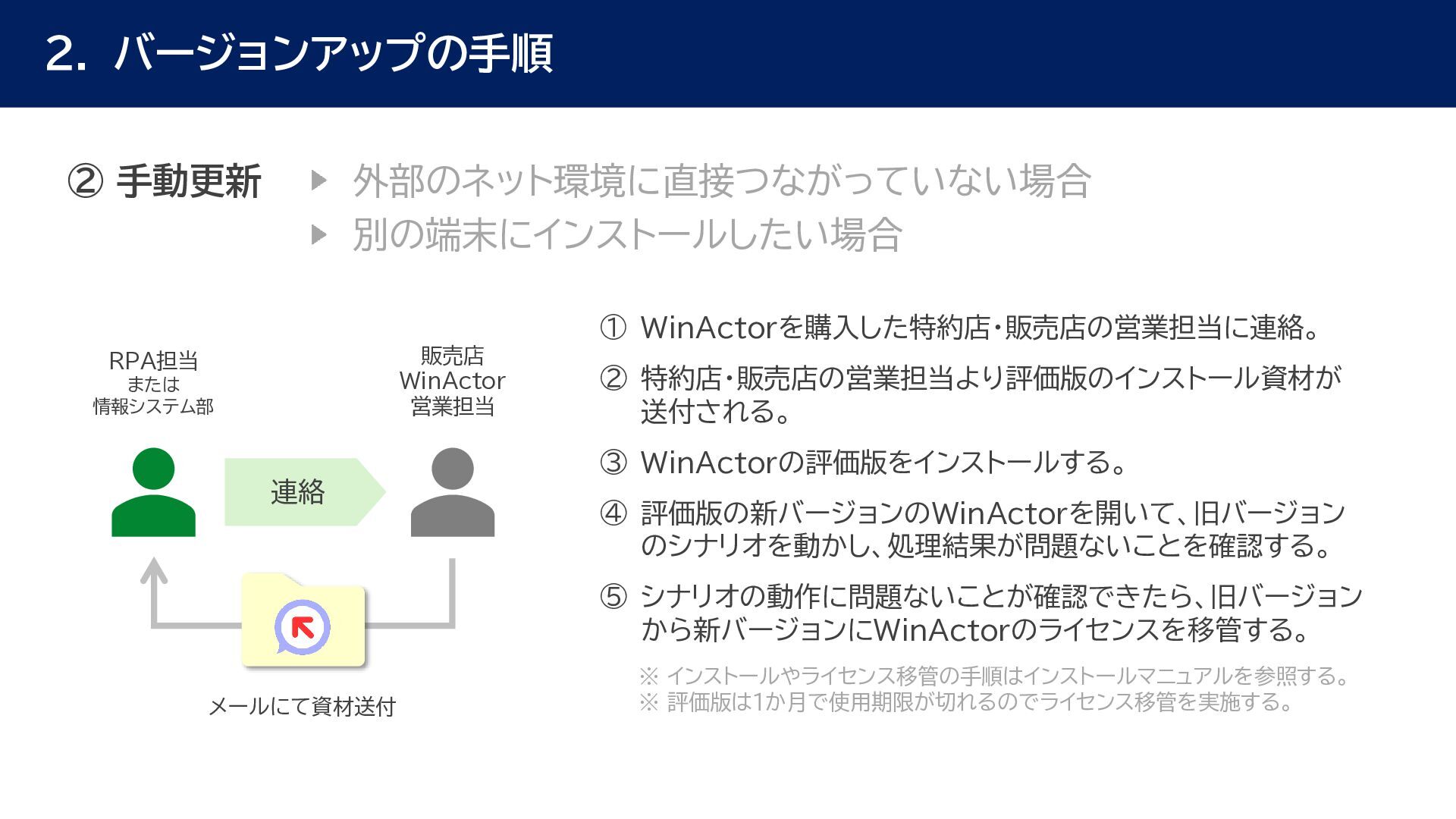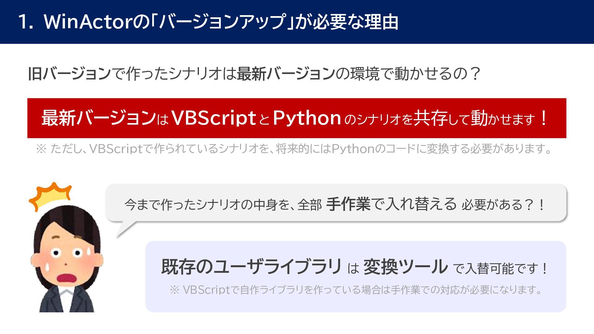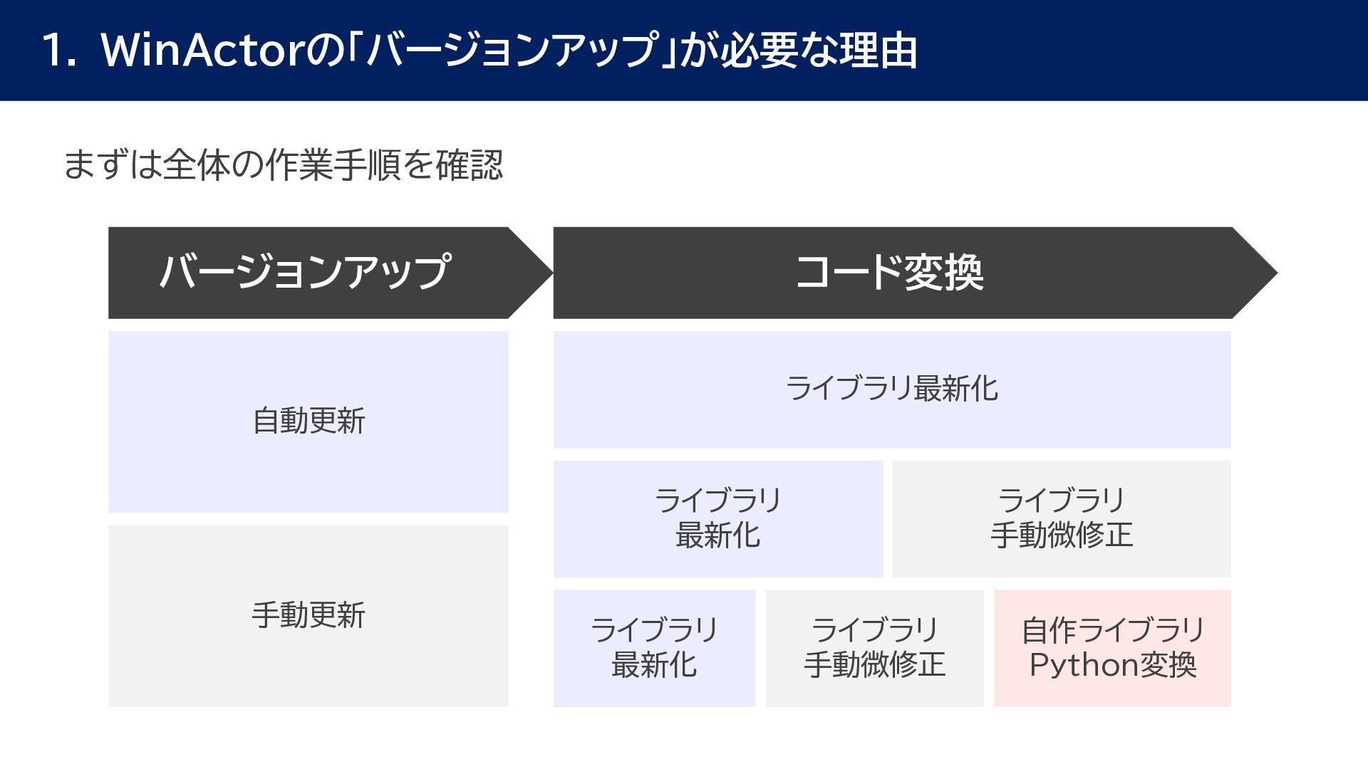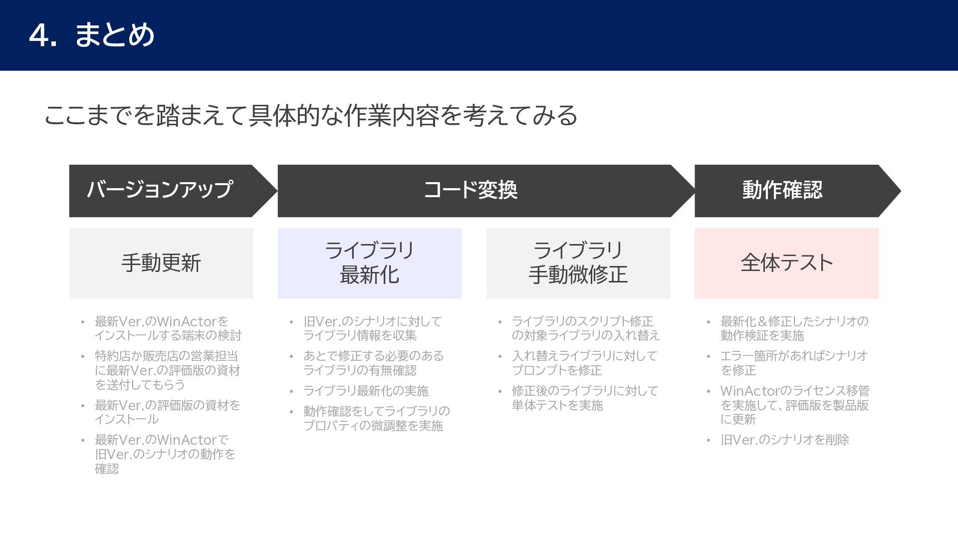 動作確認 全体テスト • 最新Ver.のWinActorを インストールする端末の検討 • 特約店か販売店の営業担当 に最新Ver.の評価版の資材 を送付してもらう • 最新Ver.の評価版の資材を インストール • 最新Ver.のWinActorで 旧Ver.のシナリオの動作を 確認 • 旧Ver.のシナリオに対して ライブラリ情報を収集 • あとで修正する必要のある ライブラリの有無確認 • ライブラリ最新化の実施 • 動作確認をしてライブラリの プロパティの微調整を実施 • ライブラリのスクリプト修正 の対象ライブラリの入れ替え • 入れ替えライブラリに対して プロンプトを修正 • 修正後のライブラリに対して 単体テストを実施 • 最新化&修正したシナリオの 動作検証を実施 • エラー箇所があればシナリオ を修正 • WinActorのライセンス移管 を実施して、評価版を製品版 に更新 • 旧Ver.のシナリオを削除