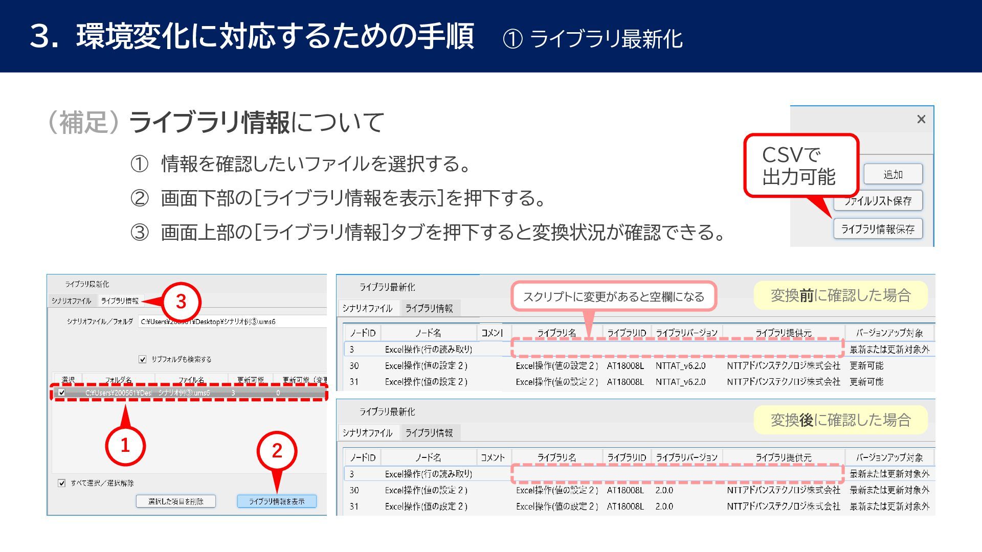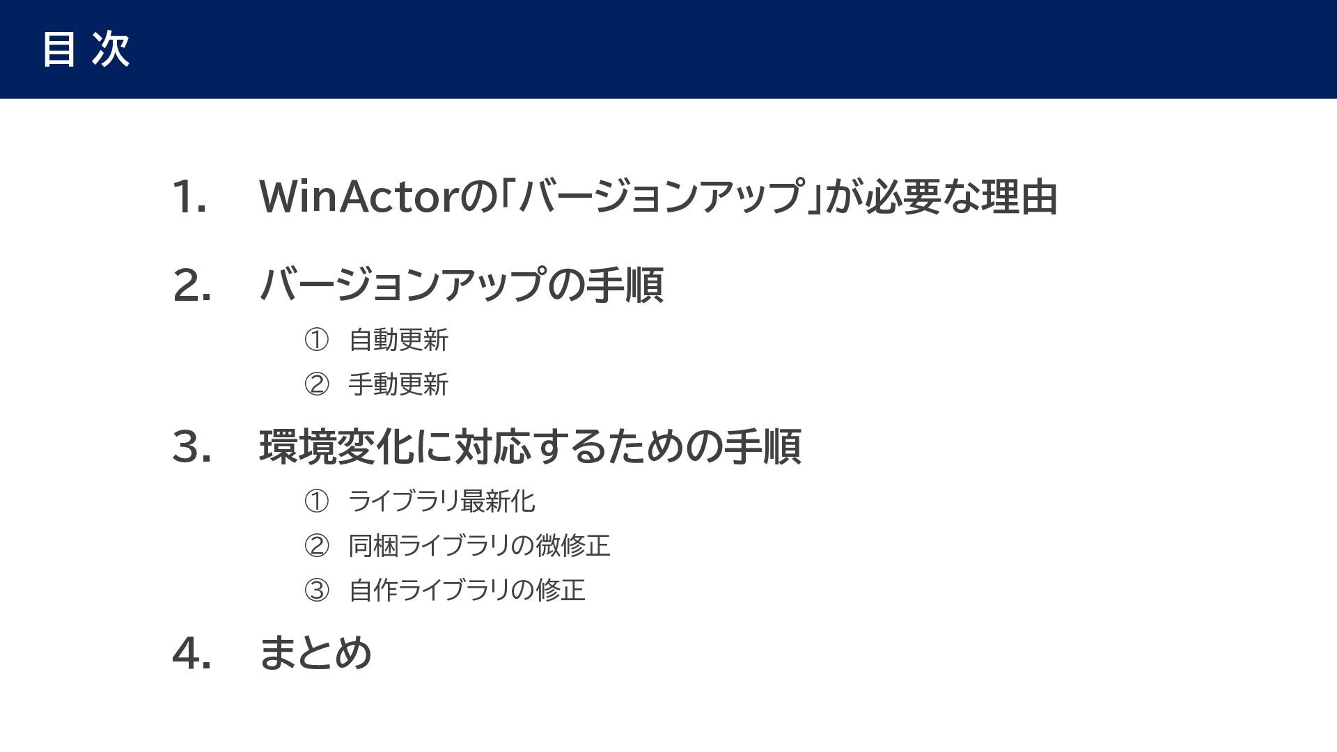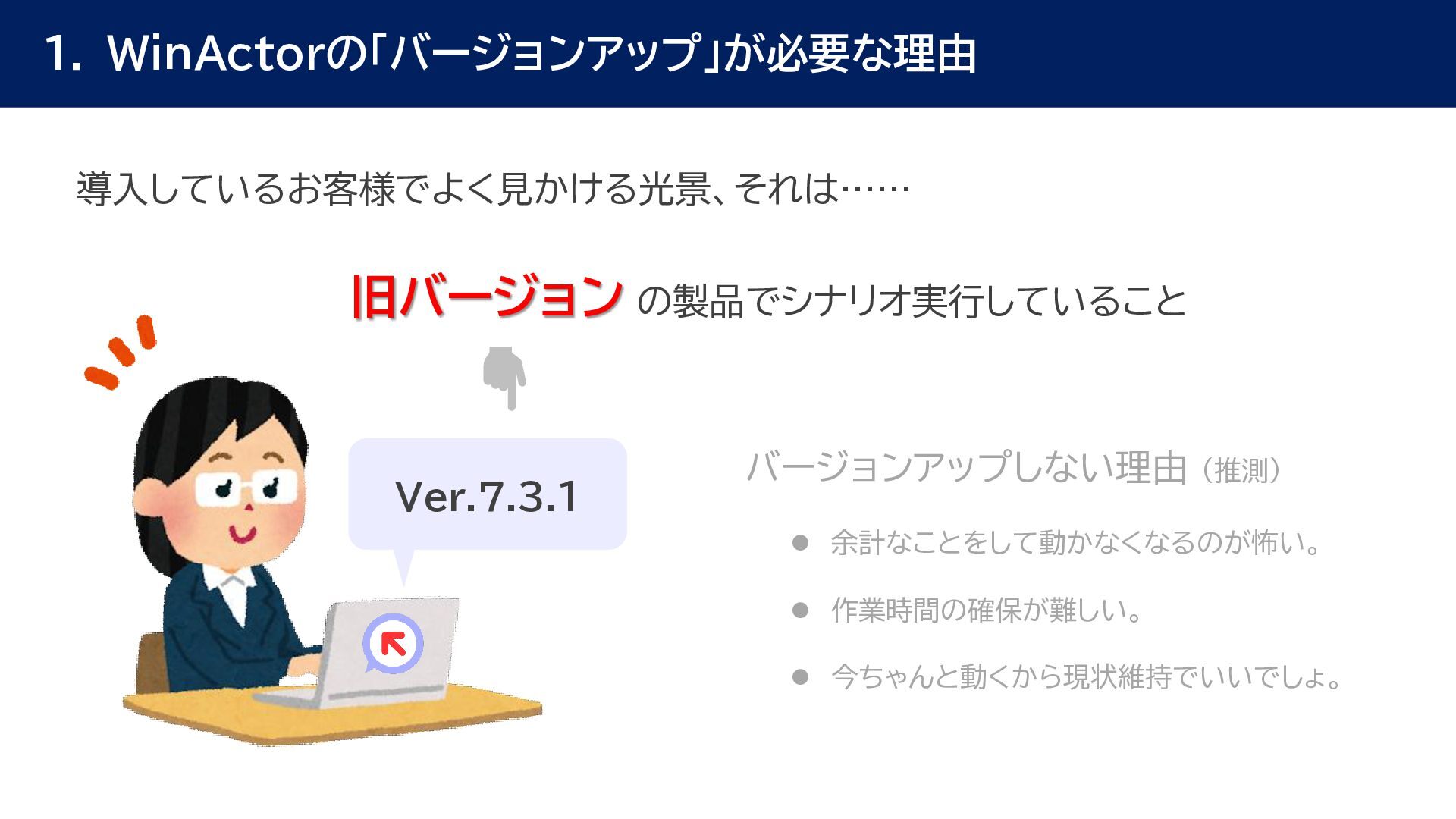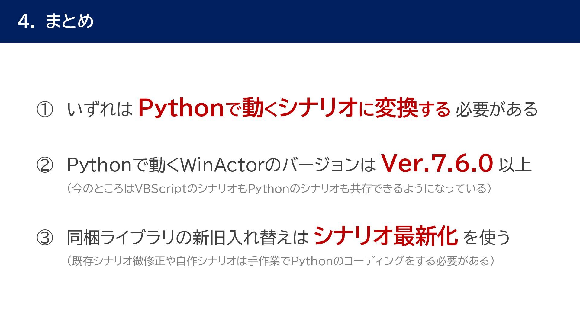 動作確認 全体テスト • 最新Ver.のWinActorを インストールする端末の検討 • 特約店か販売店の営業担当 に最新Ver.の評価版の資材 を送付してもらう • 最新Ver.の評価版の資材を インストール • 最新Ver.のWinActorで 旧Ver.のシナリオの動作を 確認 • 旧Ver.のシナリオに対して ライブラリ情報を収集 • あとで修正する必要のある ライブラリの有無確認 • ライブラリ最新化の実施 • 動作確認をしてライブラリの プロパティの微調整を実施 • ライブラリのスクリプト修正 の対象ライブラリの入れ替え • 入れ替えライブラリに対して プロンプトを修正 • 修正後のライブラリに対して 単体テストを実施 • 最新化&修正したシナリオの 動作検証を実施 • エラー箇所があればシナリオ を修正 • WinActorのライセンス移管 を実施して、評価版を製品版 に更新 • 旧Ver.のシナリオを削除