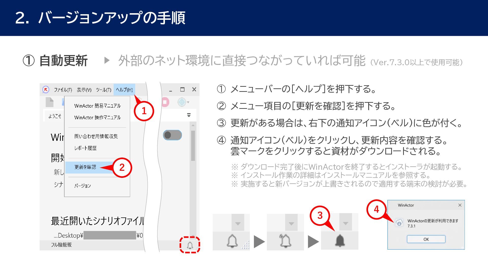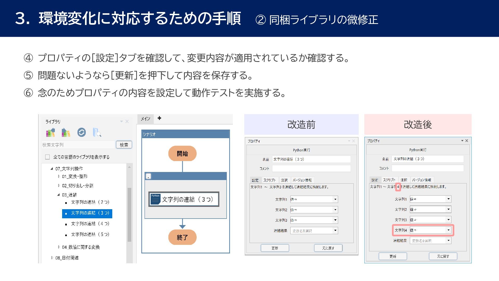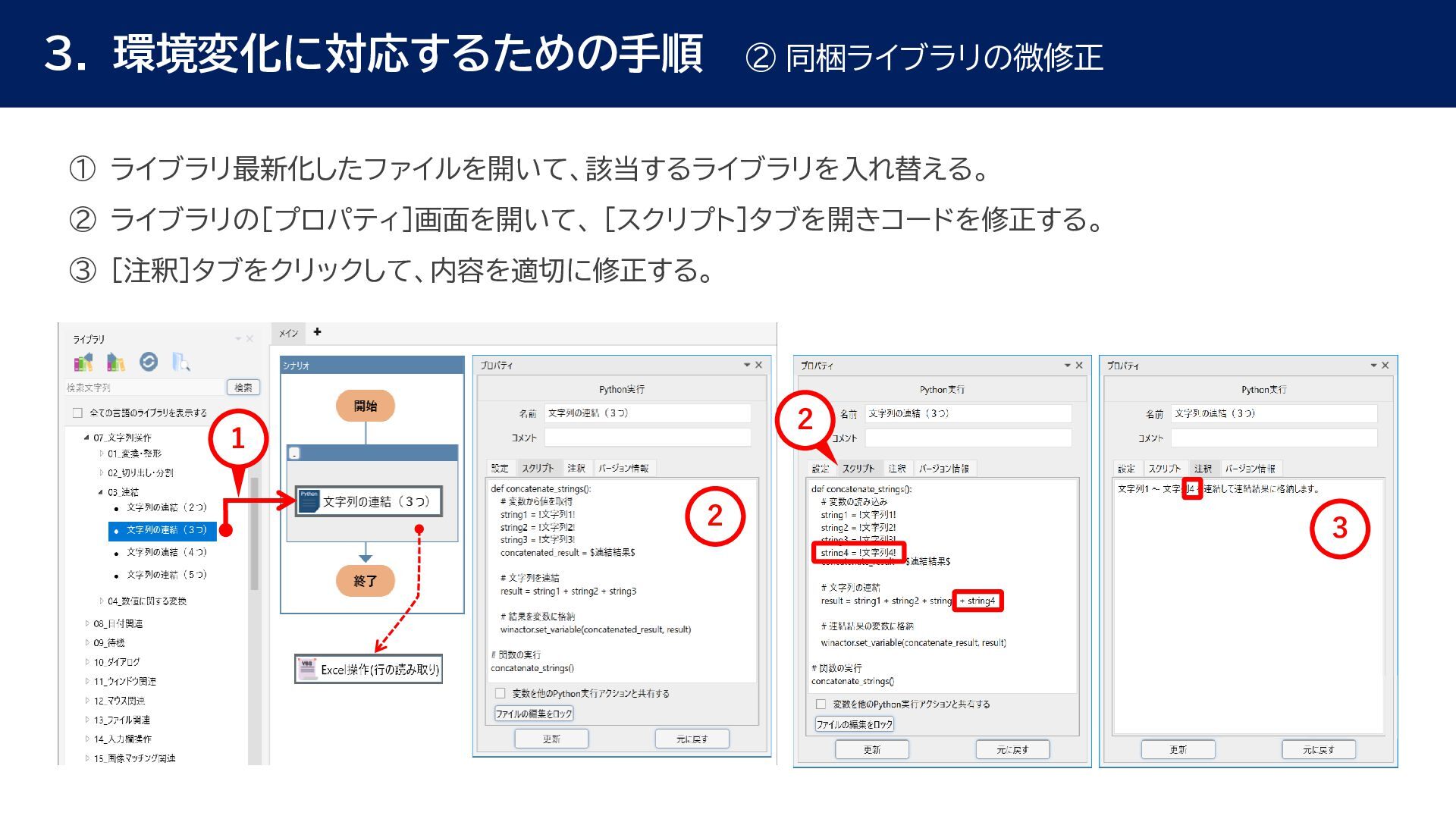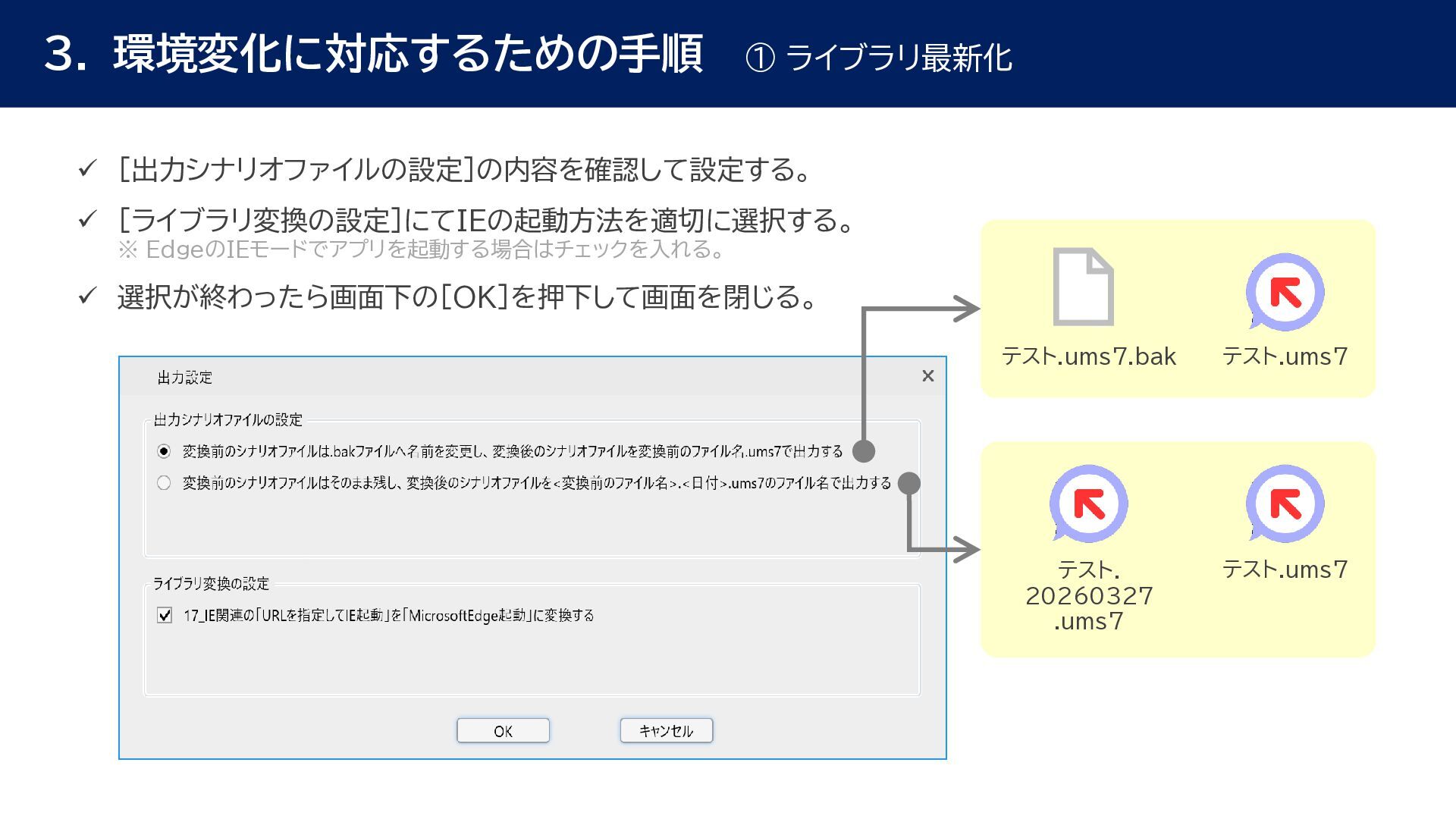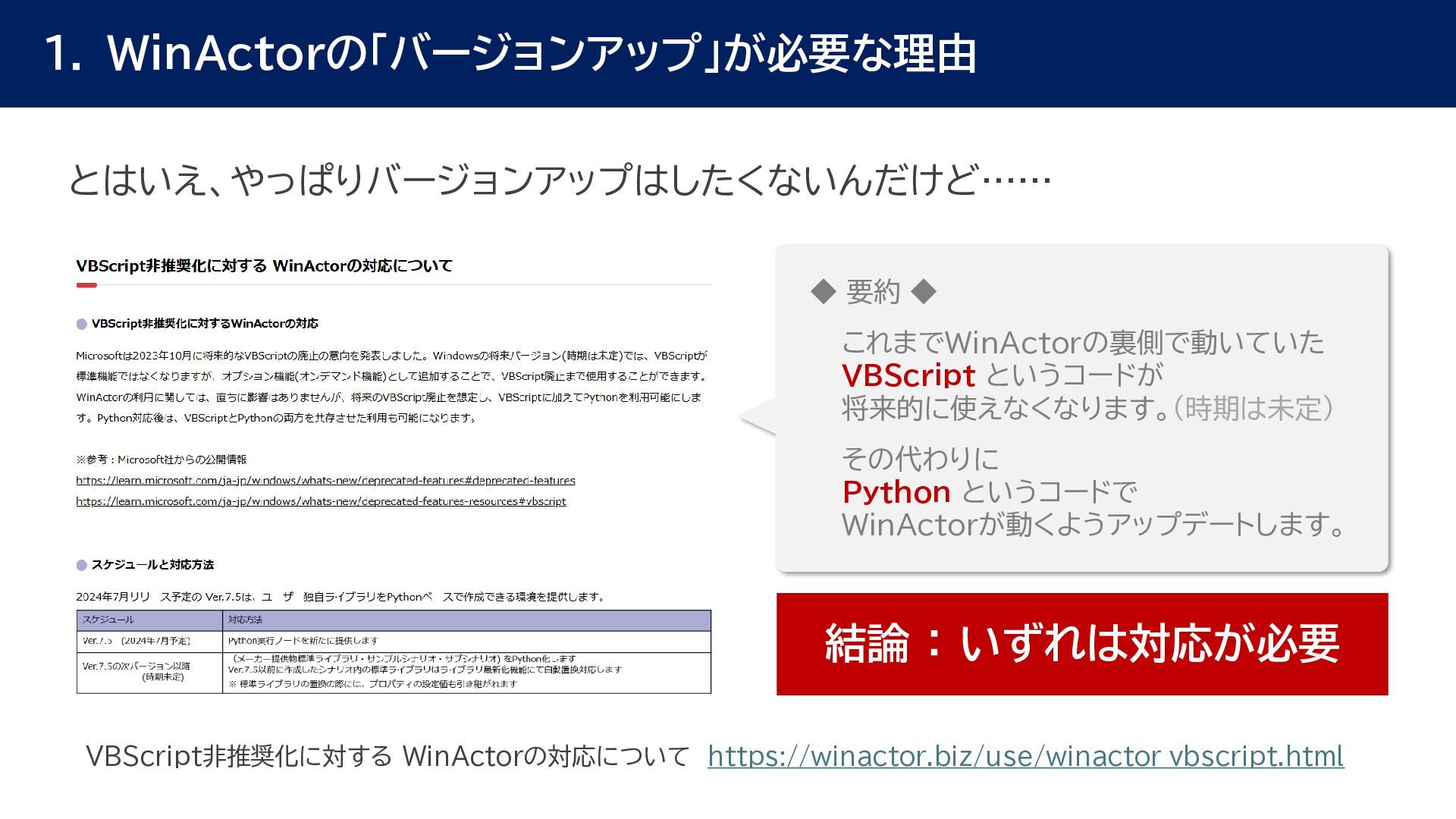 動作確認 全体テスト • 最新Ver.のWinActorを インストールする端末の検討 • 特約店か販売店の営業担当 に最新Ver.の評価版の資材 を送付してもらう • 最新Ver.の評価版の資材を インストール • 最新Ver.のWinActorで 旧Ver.のシナリオの動作を 確認 • 旧Ver.のシナリオに対して ライブラリ情報を収集 • あとで修正する必要のある ライブラリの有無確認 • ライブラリ最新化の実施 • 動作確認をしてライブラリの プロパティの微調整を実施 • ライブラリのスクリプト修正 の対象ライブラリの入れ替え • 入れ替えライブラリに対して プロンプトを修正 • 修正後のライブラリに対して 単体テストを実施 • 最新化&修正したシナリオの 動作検証を実施 • エラー箇所があればシナリオ を修正 • WinActorのライセンス移管 を実施して、評価版を製品版 に更新 • 旧Ver.のシナリオを削除