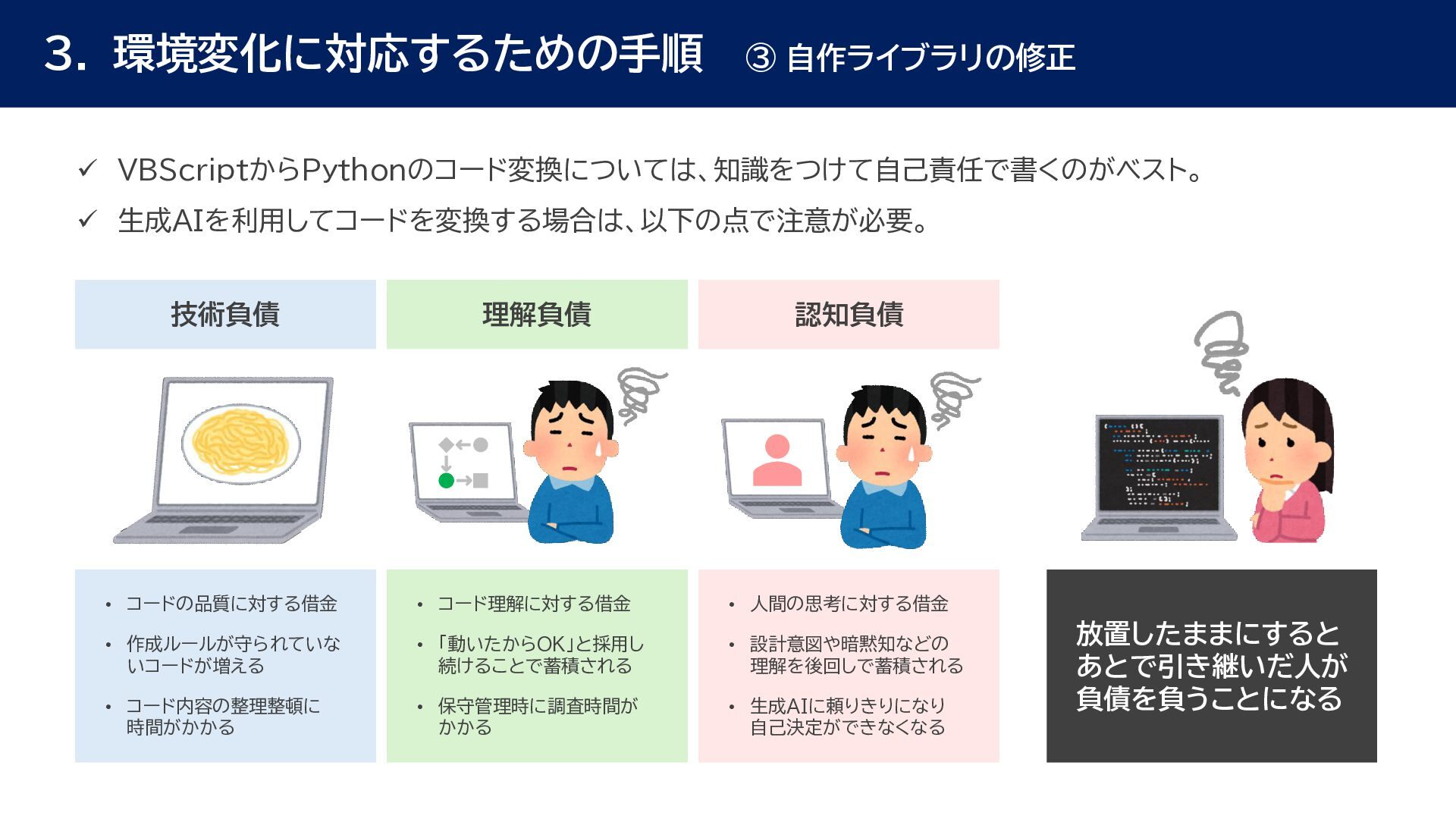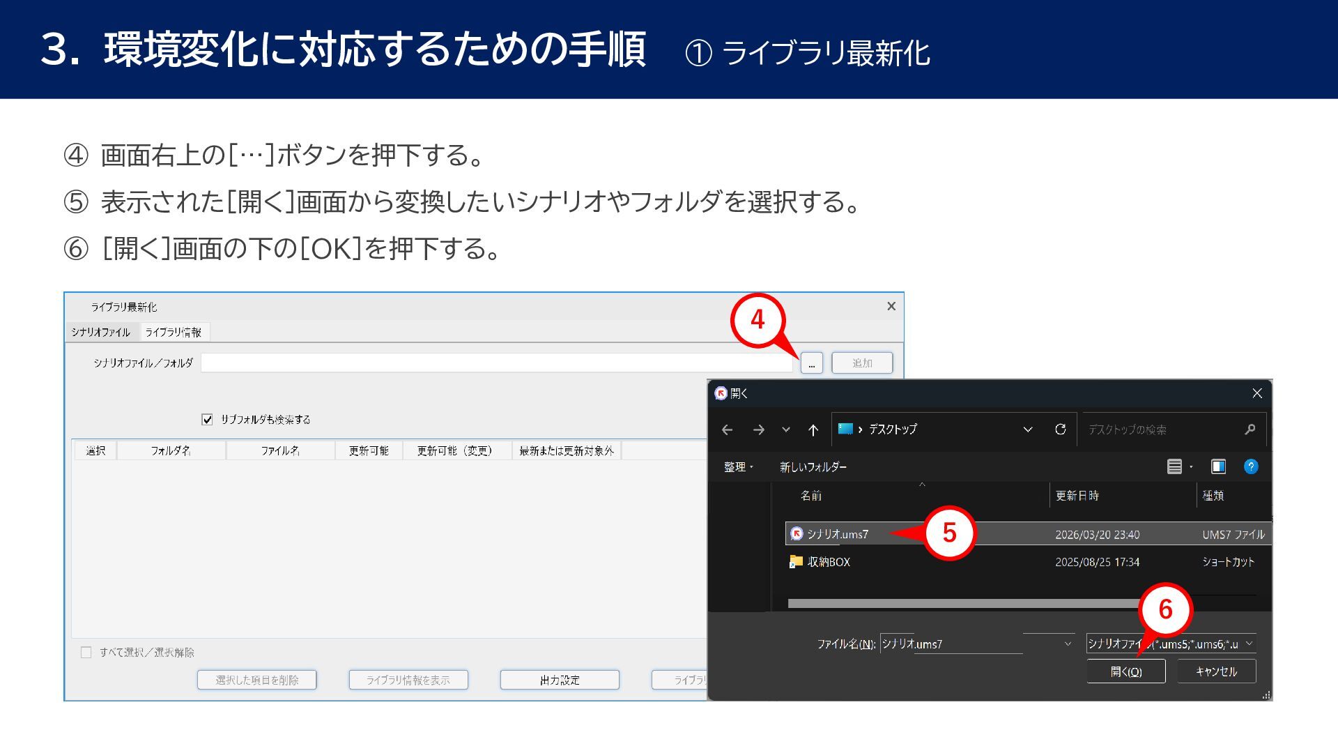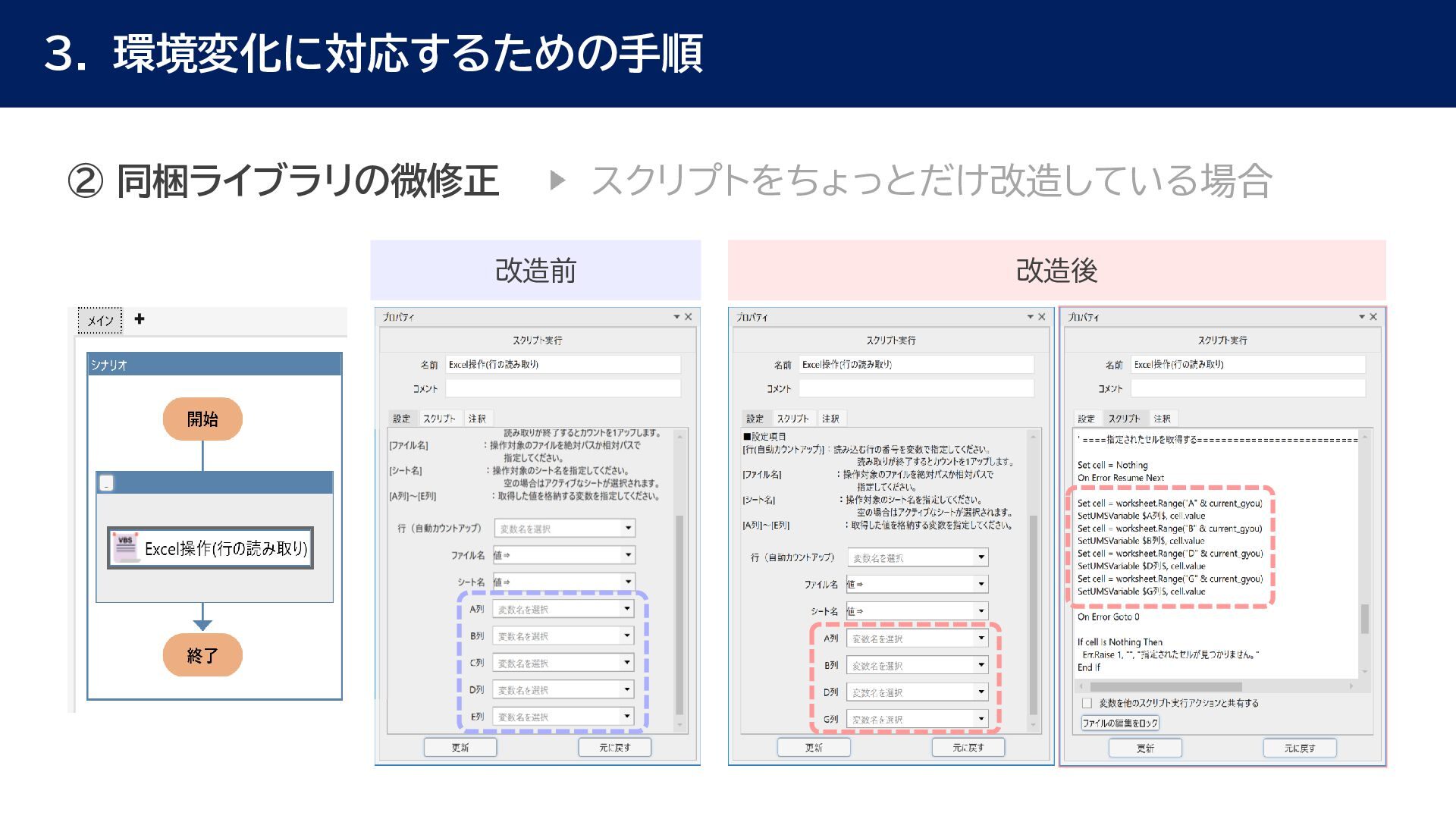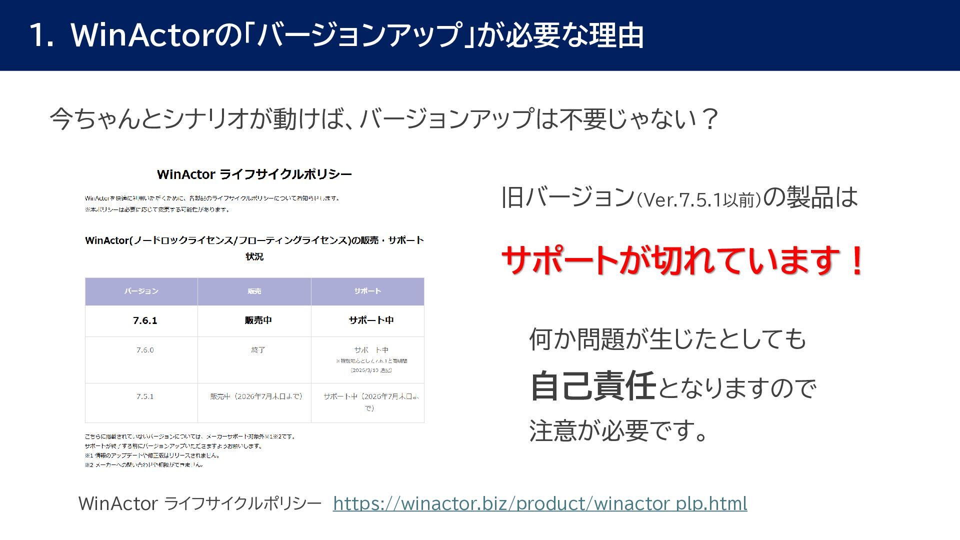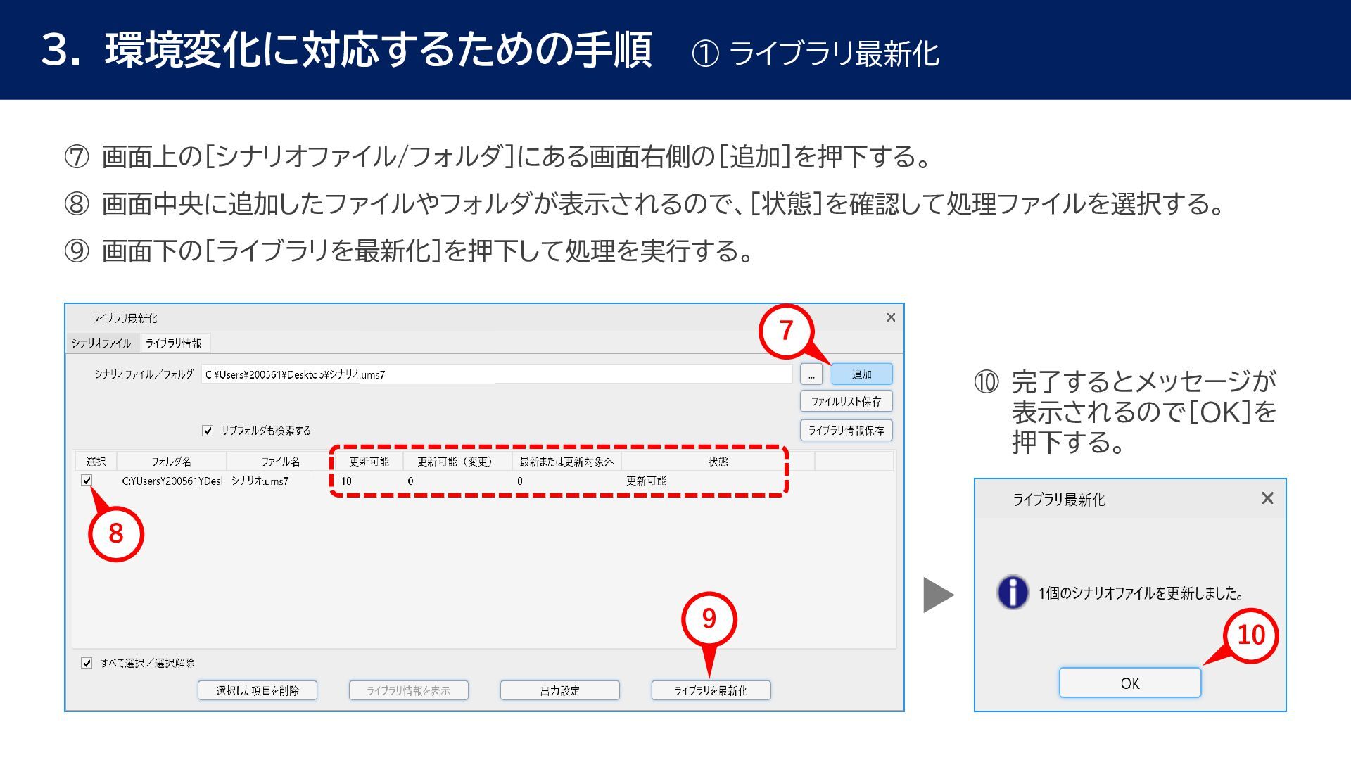動作確認 全体テスト • 最新Ver.のWinActorを インストールする端末の検討 • 特約店か販売店の営業担当 に最新Ver.の評価版の資材 を送付してもらう • 最新Ver.の評価版の資材を インストール • 最新Ver.のWinActorで 旧Ver.のシナリオの動作を 確認 • 旧Ver.のシナリオに対して ライブラリ情報を収集 • あとで修正する必要のある ライブラリの有無確認 • ライブラリ最新化の実施 • 動作確認をしてライブラリの プロパティの微調整を実施 • ライブラリのスクリプト修正 の対象ライブラリの入れ替え • 入れ替えライブラリに対して プロンプトを修正 • 修正後のライブラリに対して 単体テストを実施 • 最新化&修正したシナリオの 動作検証を実施 • エラー箇所があればシナリオ を修正 • WinActorのライセンス移管 を実施して、評価版を製品版 に更新 • 旧Ver.のシナリオを削除