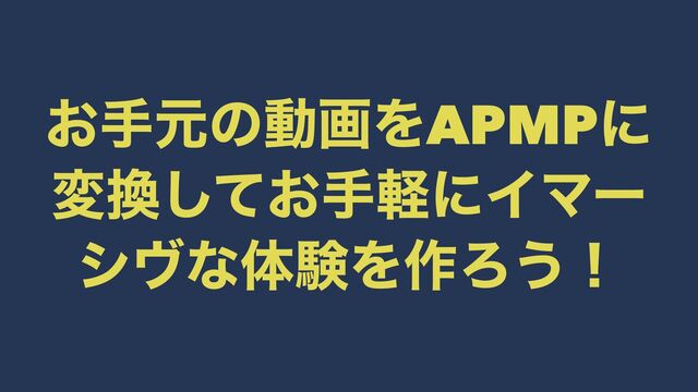 APMPܗࣜͷಈըͷ࡞Γํ 1. CLIπʔϧʢavconvertʣ·ͨmacOSʢbetaʣͷػೳΛͬ ͯม͢Δ 2. طଘͷҰ෦ͷΧϝϥͰͬͨಈըࣗಈͰมͰ͖Δ 3. APIΛͬͯม͢Δ(Appleͷαϯϓϧίʔυ͋Γ)