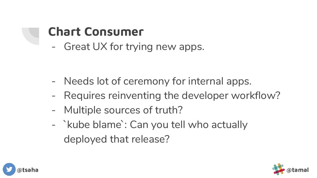 Needs lot of ceremony for internal apps. - Requires reinventing the developer workflow? - Multiple sources of truth? - `kube blame`: Can you tell who actually deployed that release? @tsaha @tamal