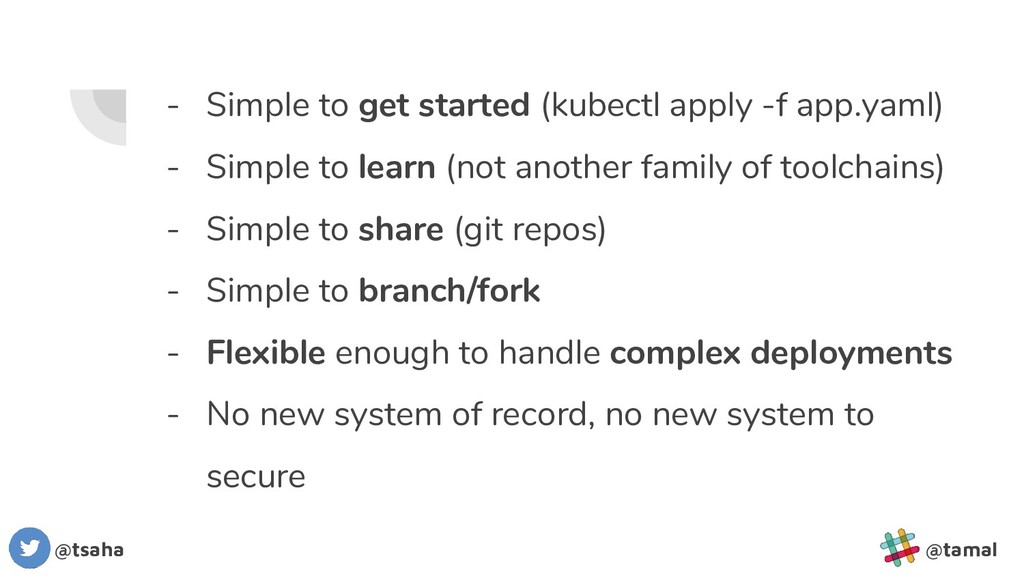Simple to learn (not another family of toolchains) - Simple to share (git repos) - Simple to branch/fork - Flexible enough to handle complex deployments - No new system of record, no new system to secure @tsaha @tamal