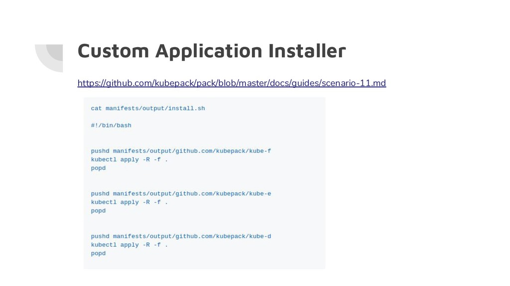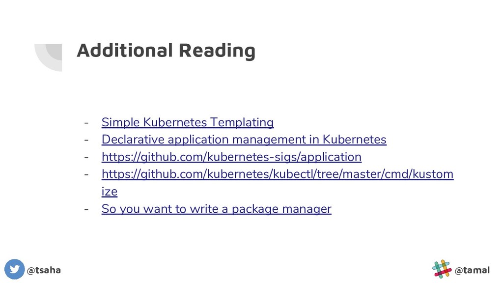 in Kubernetes - https://github.com/kubernetes-sigs/application - https://github.com/kubernetes/kubectl/tree/master/cmd/kustom ize - So you want to write a package manager @tsaha @tamal
