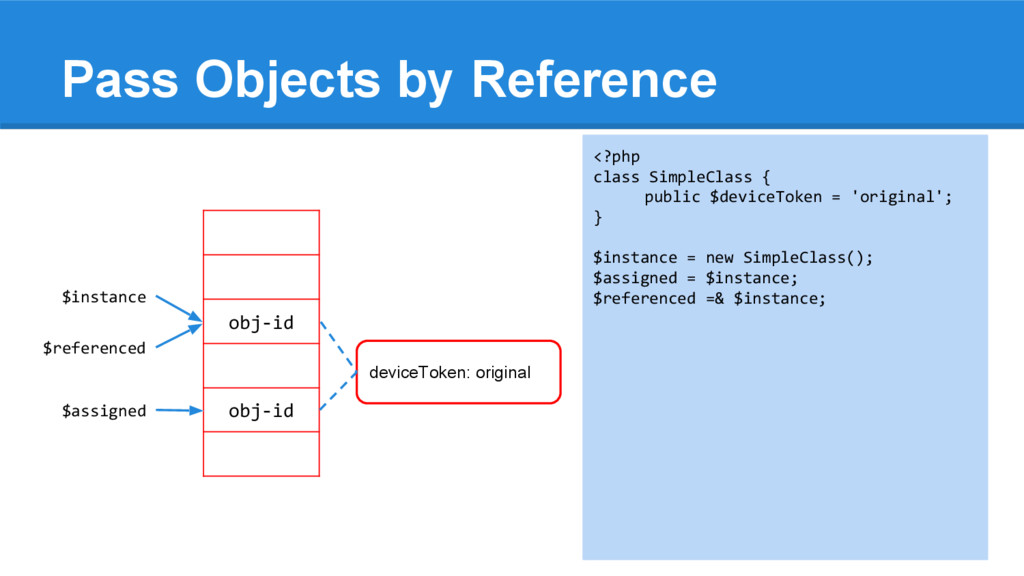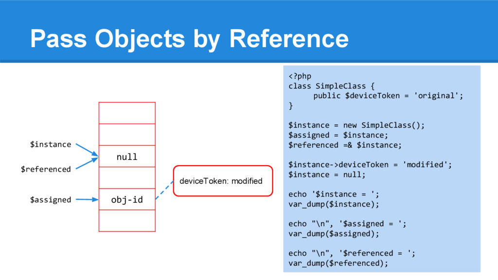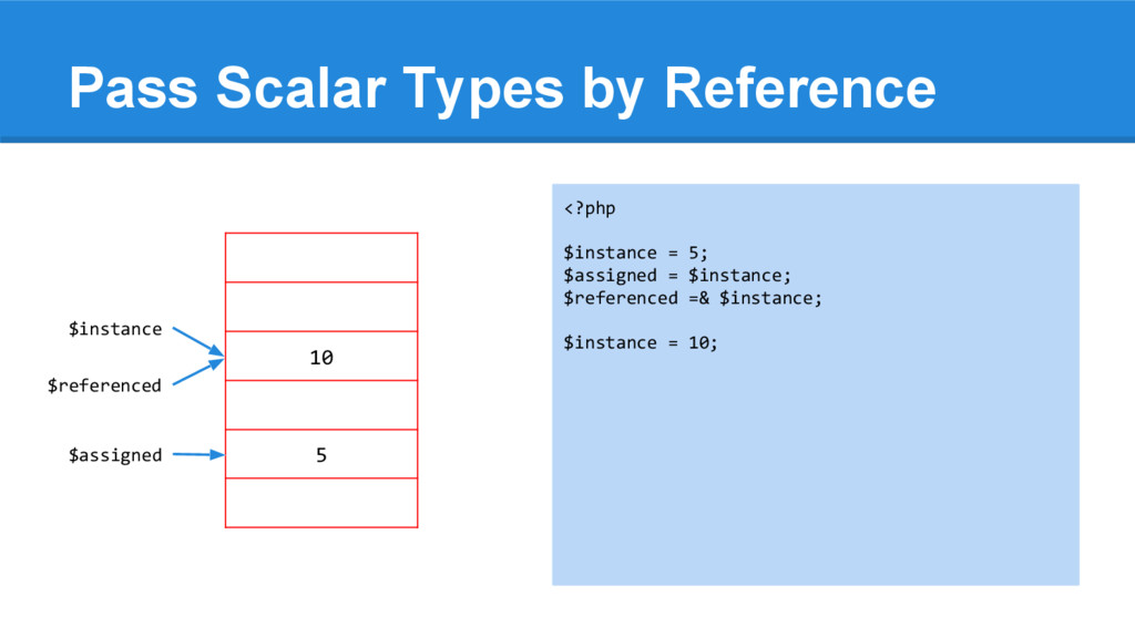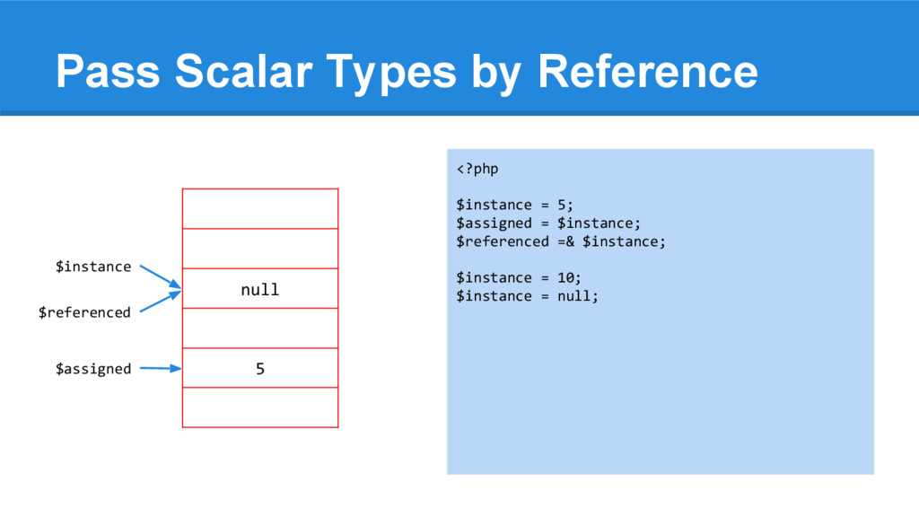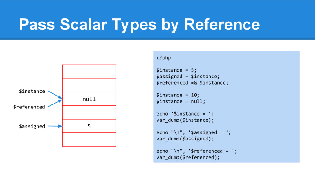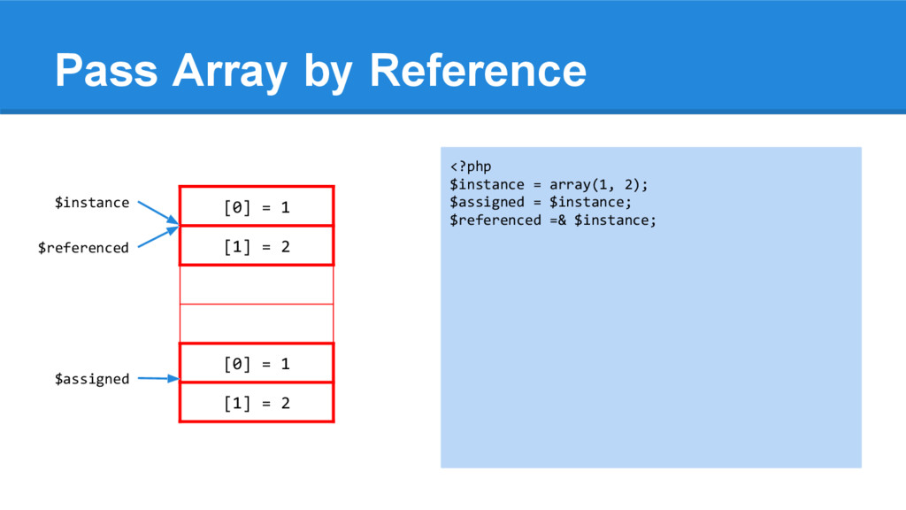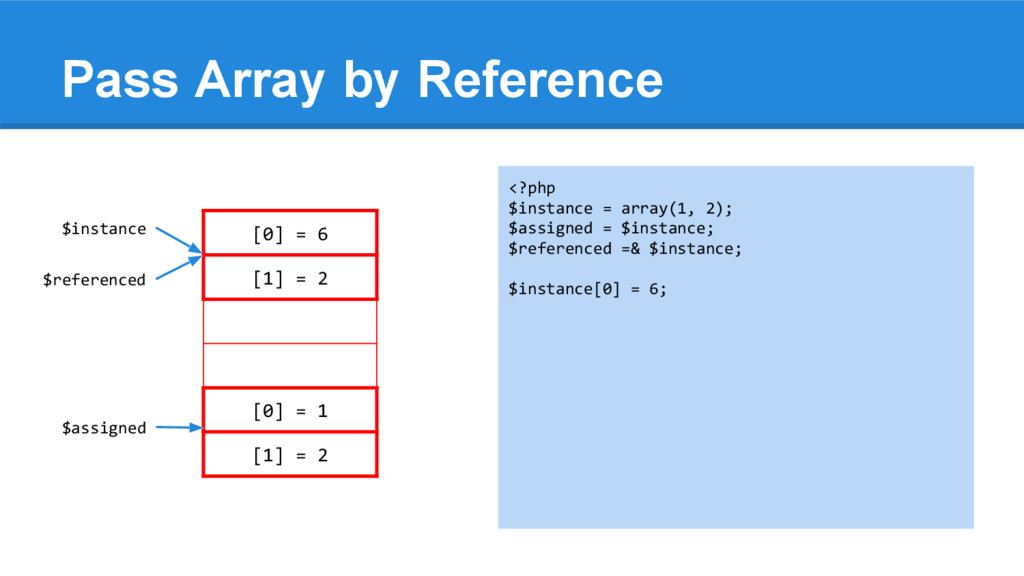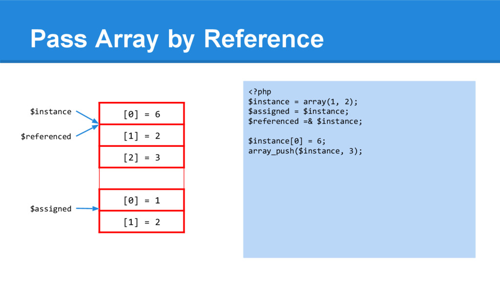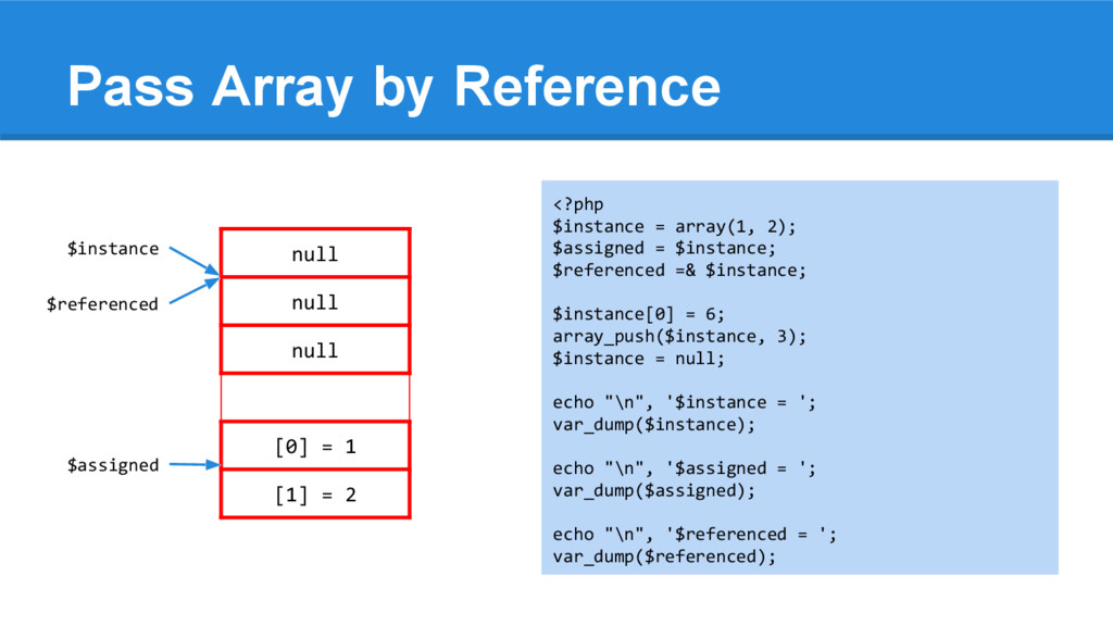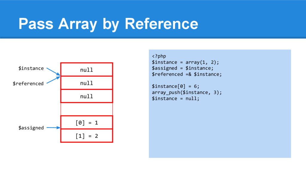 [1] = 2 <?php $instance = array(1, 2); $assigned = $instance; $referenced =& $instance; $instance[0] = 6; array_push($instance, 3); $instance = null; echo "\n", '$instance = '; var_dump($instance); echo "\n", '$assigned = '; var_dump($assigned); echo "\n", '$referenced = '; var_dump($referenced); $instance $assigned $referenced