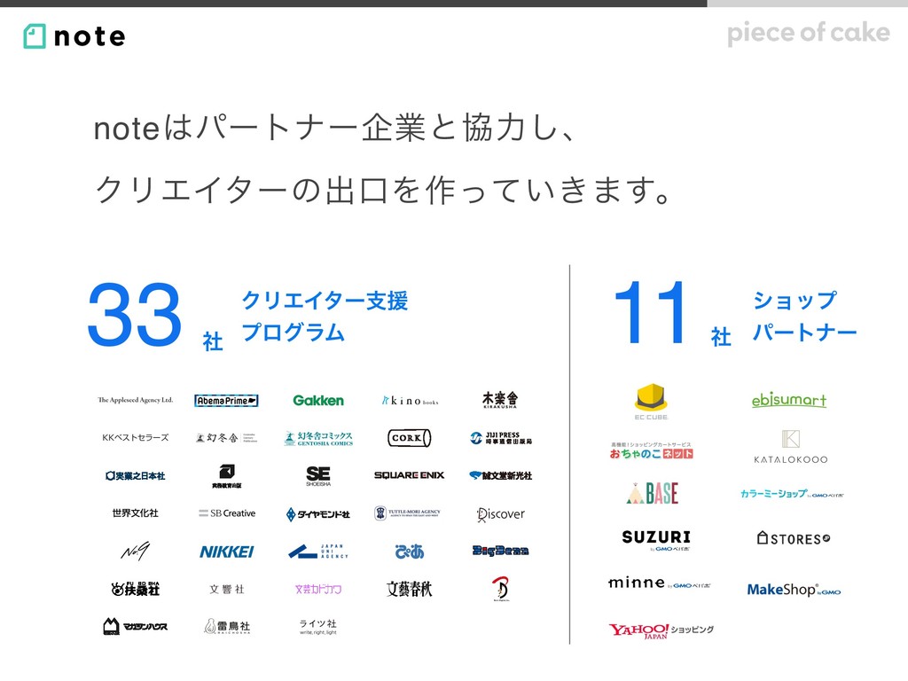 ΫϦΤΠλʔࢧԉ ϓϩάϥϜ 33 ࣾ γϣοϓ ύʔτφʔ 11 ࣾ noteύʔτφʔاۀͱڠྗ͠ɺ ΫϦΤΠλʔͷग़ޱΛ࡞͍͖ͬͯ·͢ɻ