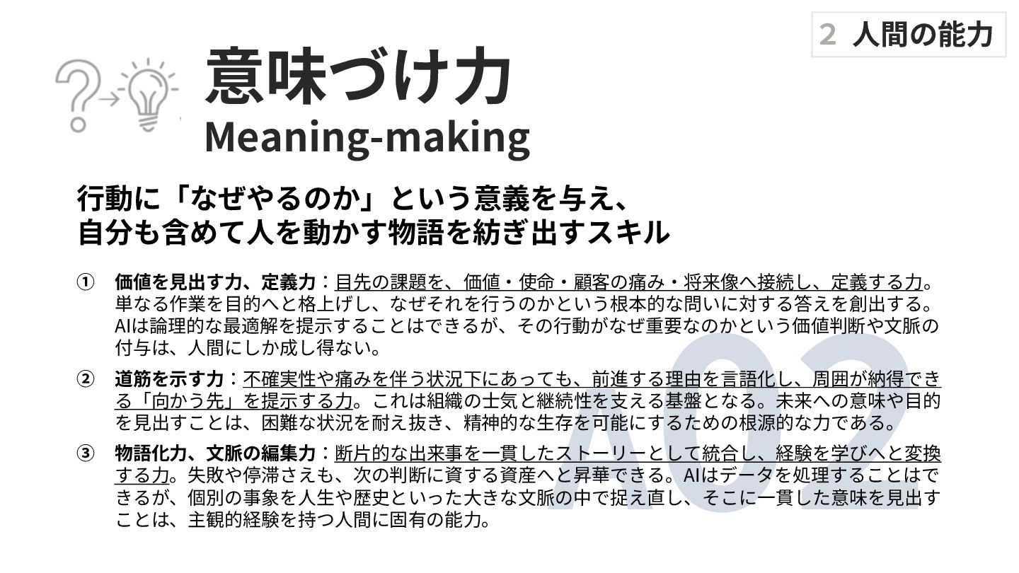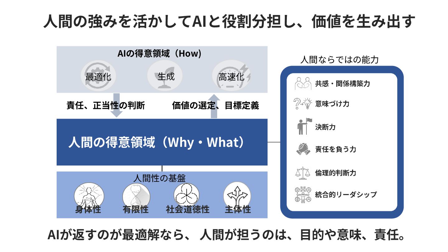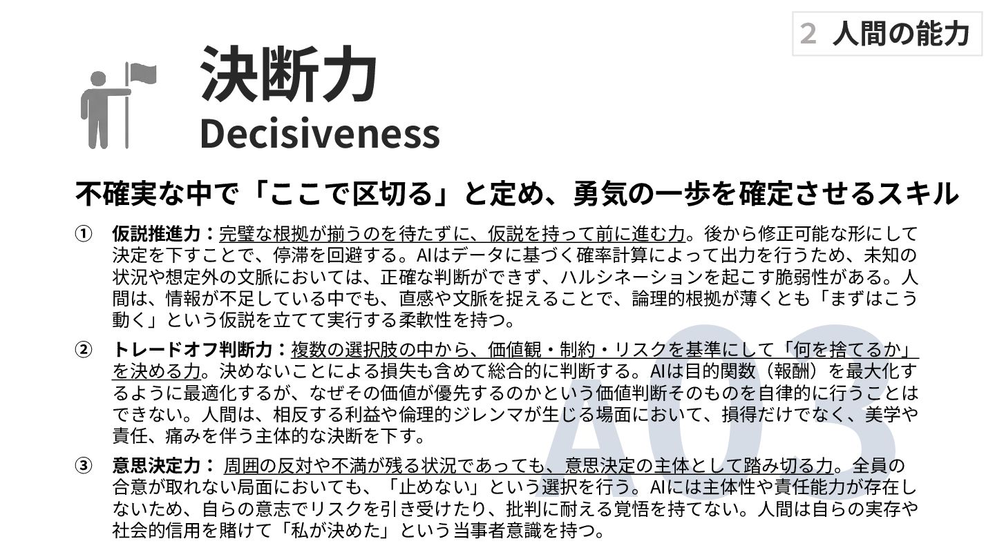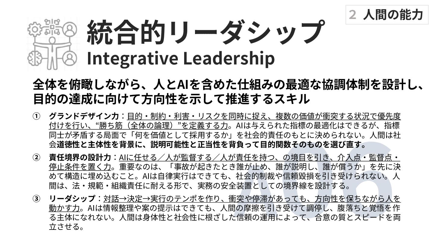② 継続的パートナーシップ構築力:誠実さ、一貫性、配慮、境界線といった「信頼の前提」を維持し、 協力関係が継続する形に整える力。単発の好意で終わらせず、継続可能性を設計する。AIと共に働く 環境下では、困難を共に乗り越えたり対話を重ねたりすることで醸成される「この人の言うことなら 信じられる」といった人間同士の信頼関係が、マネジメントの土台としてより一層重要視される。 ③ 合意形成と調停力:対立、誤解、利害の衝突を放置せず、対話の順序や場を整えて「落とし所」を作 る力。合意の質と、そこに至るまでの手続きを両立させることが求められる。職場において意見の不 一致や摩擦は避けられないものであり、これらを建設的な方法で解決に導く能力は、AIには代替でき ない人間特有の役割。 共感・関係構築力 Empathy&relationship building