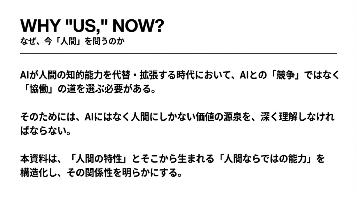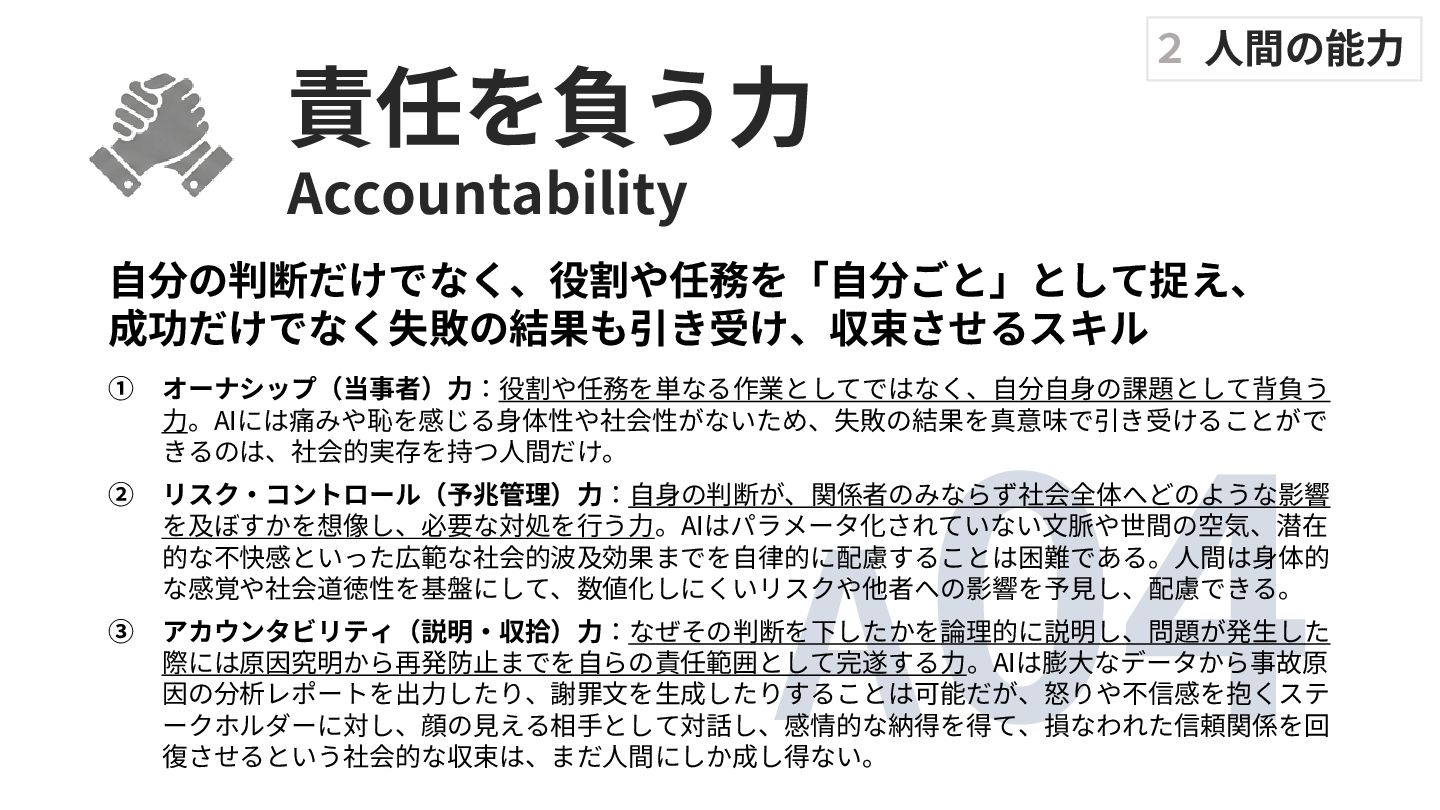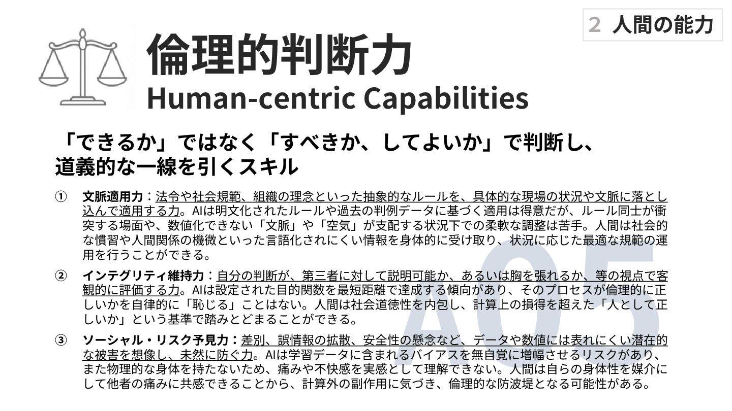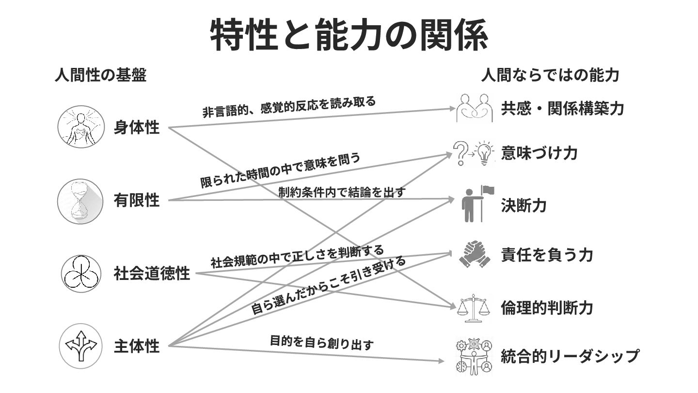 ② 継続的パートナーシップ構築力:誠実さ、一貫性、配慮、境界線といった「信頼の前提」を維持し、 協力関係が継続する形に整える力。単発の好意で終わらせず、継続可能性を設計する。AIと共に働く 環境下では、困難を共に乗り越えたり対話を重ねたりすることで醸成される「この人の言うことなら 信じられる」といった人間同士の信頼関係が、マネジメントの土台としてより一層重要視される。 ③ 合意形成と調停力:対立、誤解、利害の衝突を放置せず、対話の順序や場を整えて「落とし所」を作 る力。合意の質と、そこに至るまでの手続きを両立させることが求められる。職場において意見の不 一致や摩擦は避けられないものであり、これらを建設的な方法で解決に導く能力は、AIには代替でき ない人間特有の役割。 共感・関係構築力 Empathy&relationship building