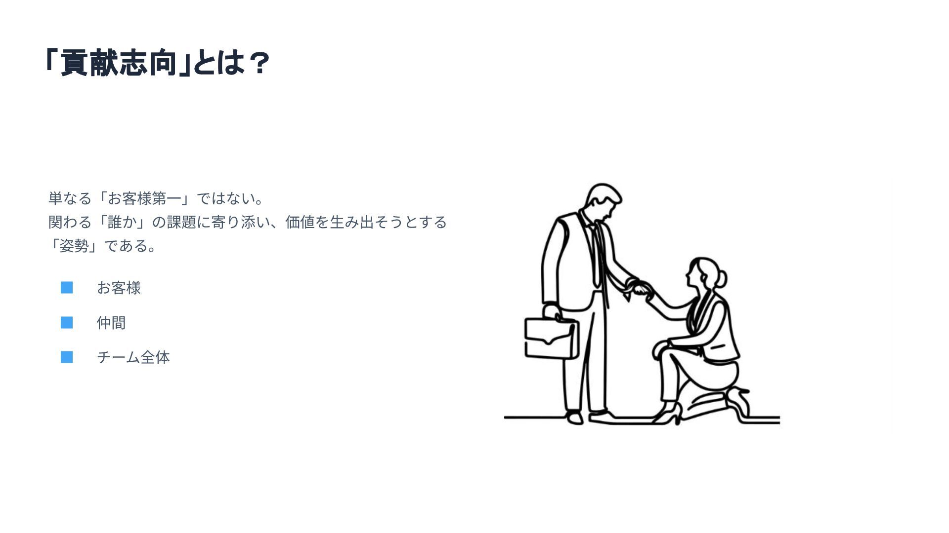 貢献志向を実践するとは、相手の立場を理解し、仮説を立て、行動に変える力を育てることです。