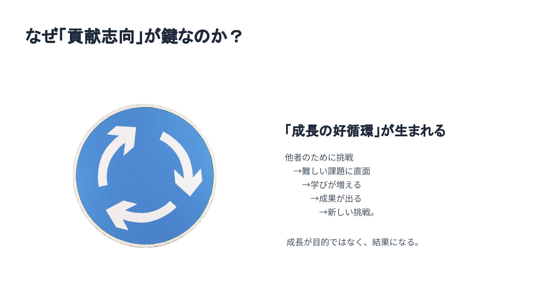 自分の成長を目的にするのではなく、「関わる他者のために何ができるか」を突き詰めることで、より難しい課題に挑戦し、学びの機会が自然に増える。結果として成果が上がり、さらに新しい挑戦がやってくる。