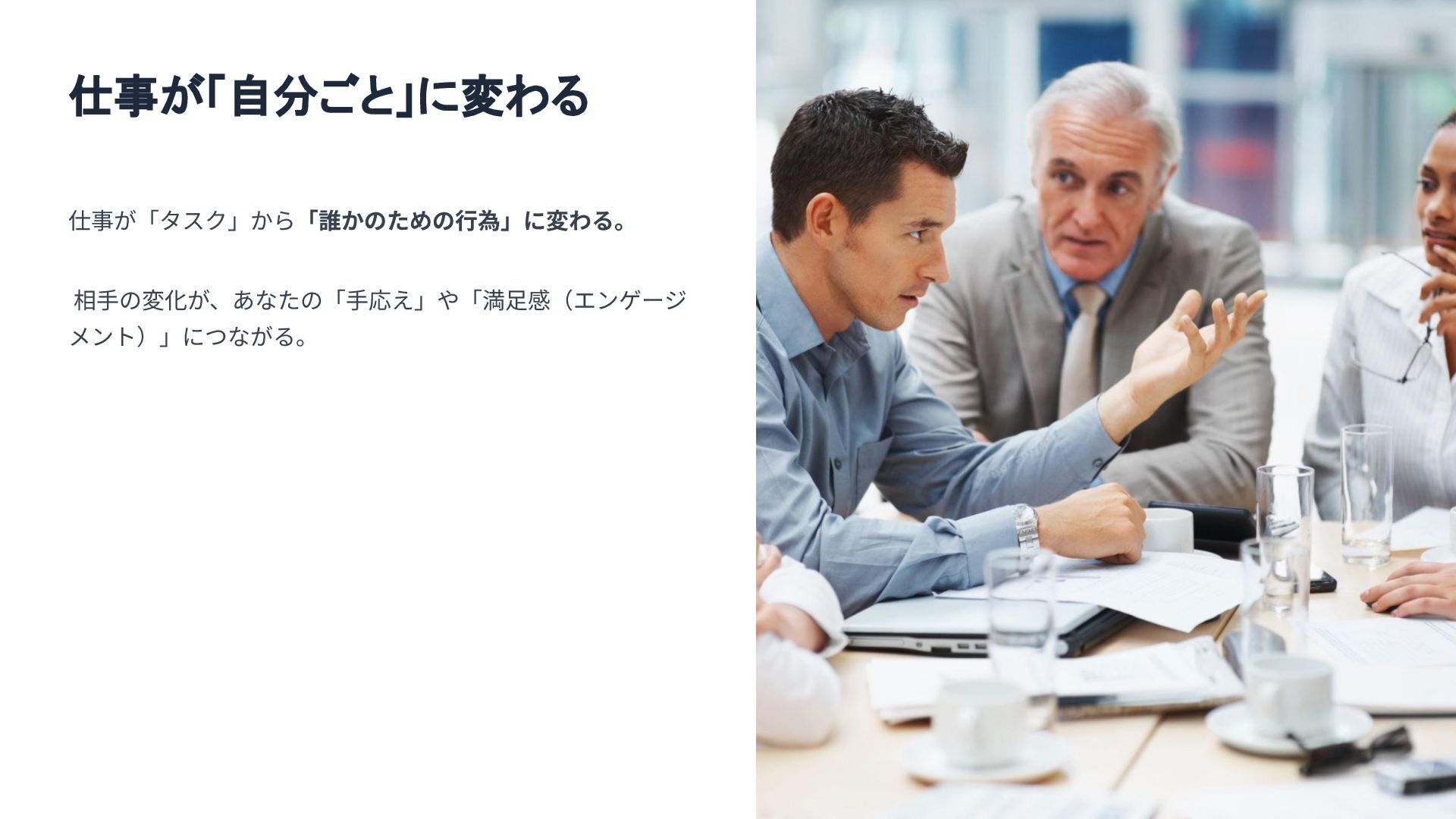 たとえば、あなたが提案やサポートで相手の課題を解いた瞬間、その「誰か」の変化が、あなた自身の手応えや成長感として残ります。