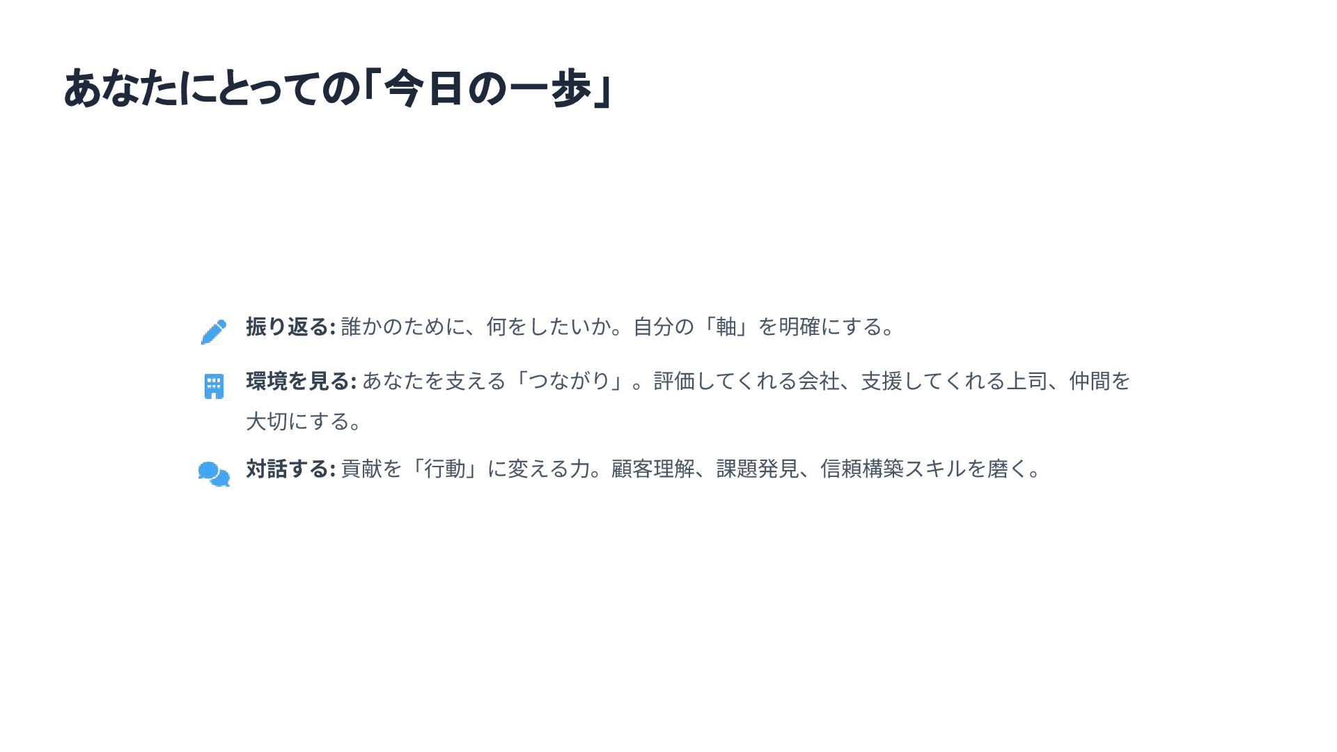 ・そして次の1〜2週間で、顧客または社内の仲間との対話を一つ設定し、「貢献志向って自分はどう実践しているか」を話してみてください。