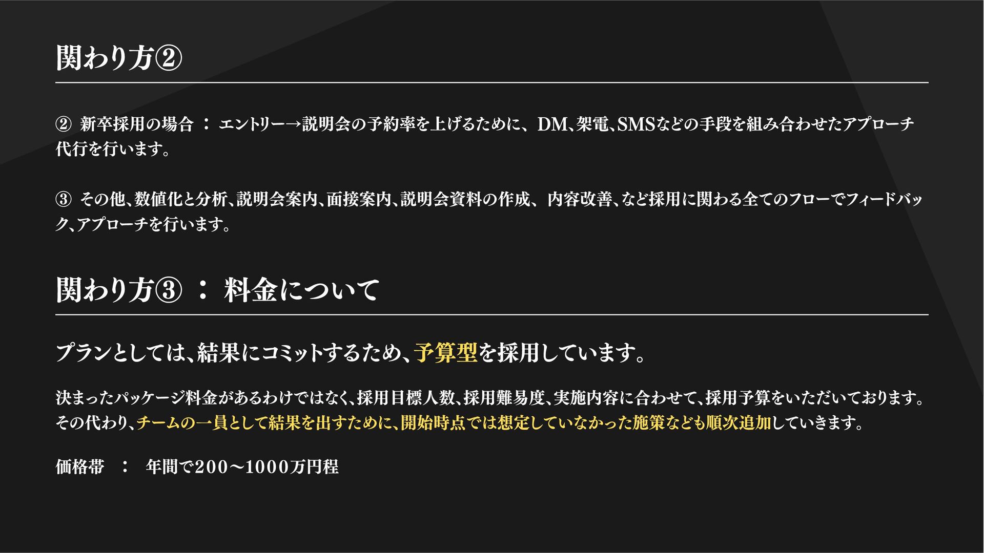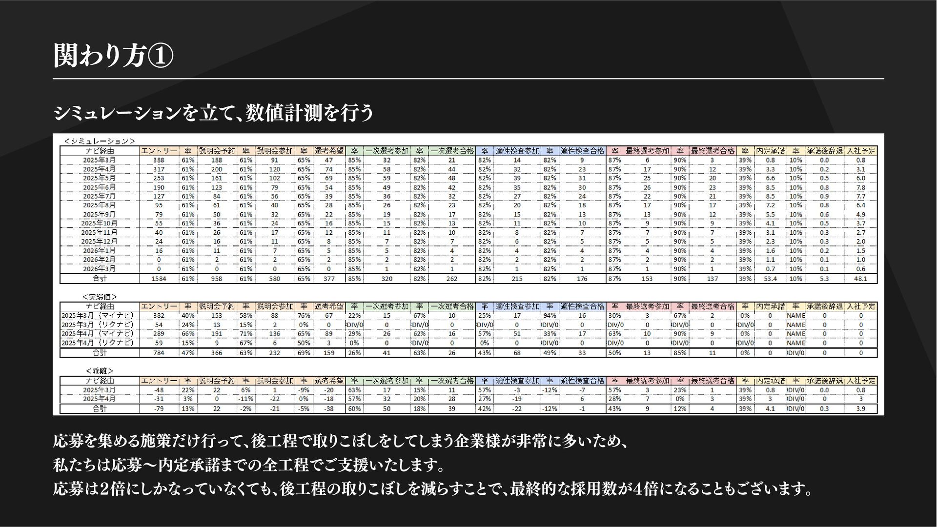 ツ化。求職者がスムーズに応募できる導線 を設計しています。 Indeed、Airwork、といった中途媒体から、マイナビ、リクナビの新卒採用媒体まで 幅広く活用しております。採用ブランディングと、プロのコピーライターが手掛ける求人は 平均で通常の3倍効果を出しています。中には昨対比20倍のアクセス、応募、採用を記録して いるものもございます。 採用ブランディング 求職者のターゲットに合わせた SNS運用 圧倒的な企画力で認知拡大 HP・採用サイト制作 流れるように応募を獲得する 媒体運用 打ち出しで結果を変える