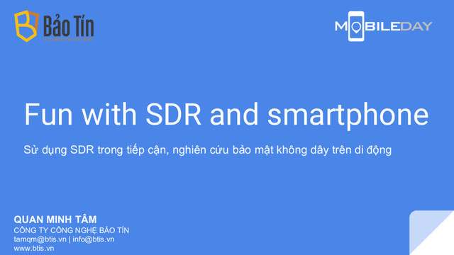 SDR (Software Defined Radio) được sử dụng rộng rãi trong ngành công nghiệp viễn thông từ vài thập kỷ gần đây. Với sức mạnh của chip xử lý phần cứng, phần mềm điều khiển và giá thành ngày càng thấp, việc sở hữu thiết bị thu/ phát sóng vô tuyến sẽ giúp người dùng dễ dàng tiếp cận với lĩnh vực nghiên cứu bảo mật mạng không dây. SDR còn cho thấy các ứng dụng quan trọng khác trong thông tin vệ tinh, thông tin dẫn đường, hàng hải, an ninh công cộng, các hệ thống IoT,...
