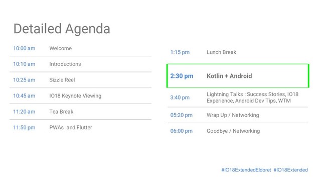10:45 am IO18 Keynote Viewing 11:20 am Tea Break 11:50 pm PWAs and Flutter Detailed Agenda 1:15 pm Lunch Break 2:30 pm Kotlin + Android 3:40 pm Lightning Talks : Success Stories, IO18 Experience, Android Dev Tips, WTM 05:20 pm Wrap Up / Networking 06:00 pm Goodbye / Networking #IO18ExtendedEldoret #IO18Extended