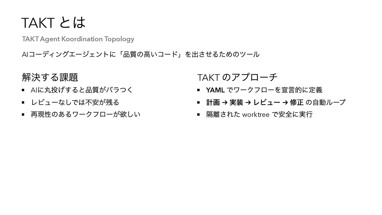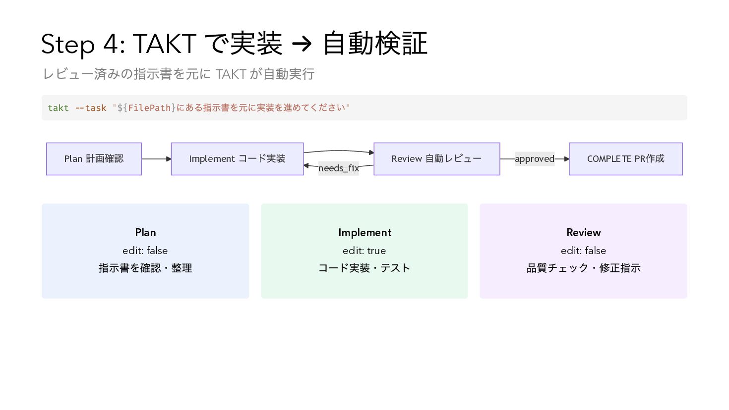 movements: - name: plan persona: planner edit: false rules: - { condition: Planning complete, next: implement } - name: implement persona: coder edit: true rules: - { condition: Implementation complete, next: review } - name: review persona: reviewer edit: false rules: - { condition: approved, next: COMPLETE } - { condition: needs_fix, next: implement }