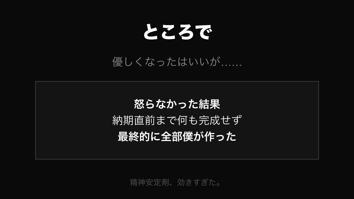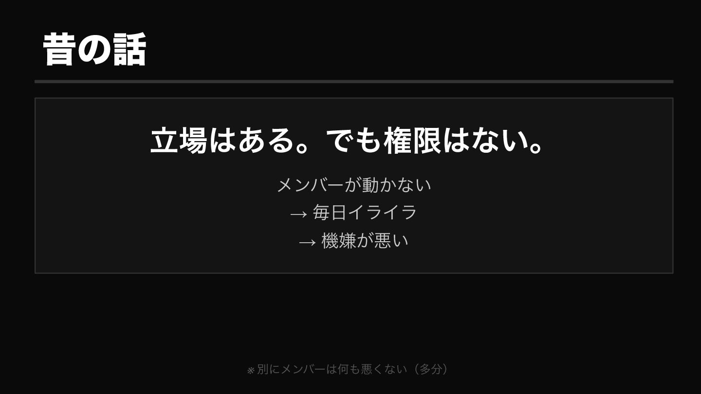 チームの管理者ポジションにいながら実質的な権限がなかった時期、メンバーが動かないことへのストレスで毎日機嫌が悪かった。