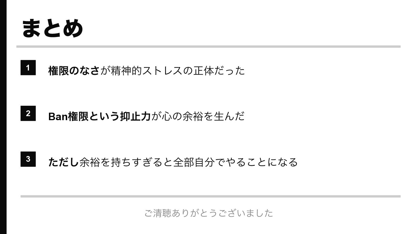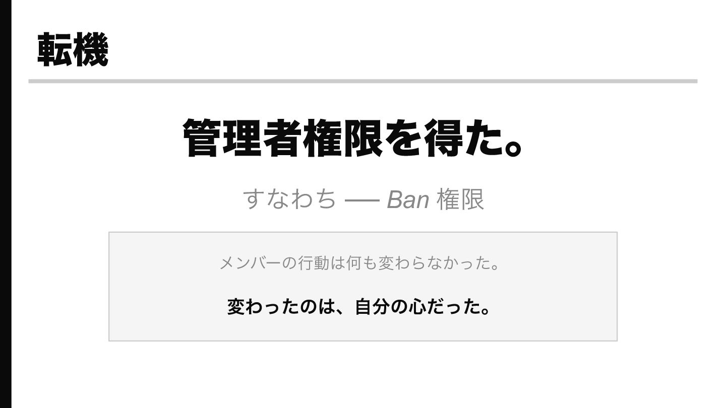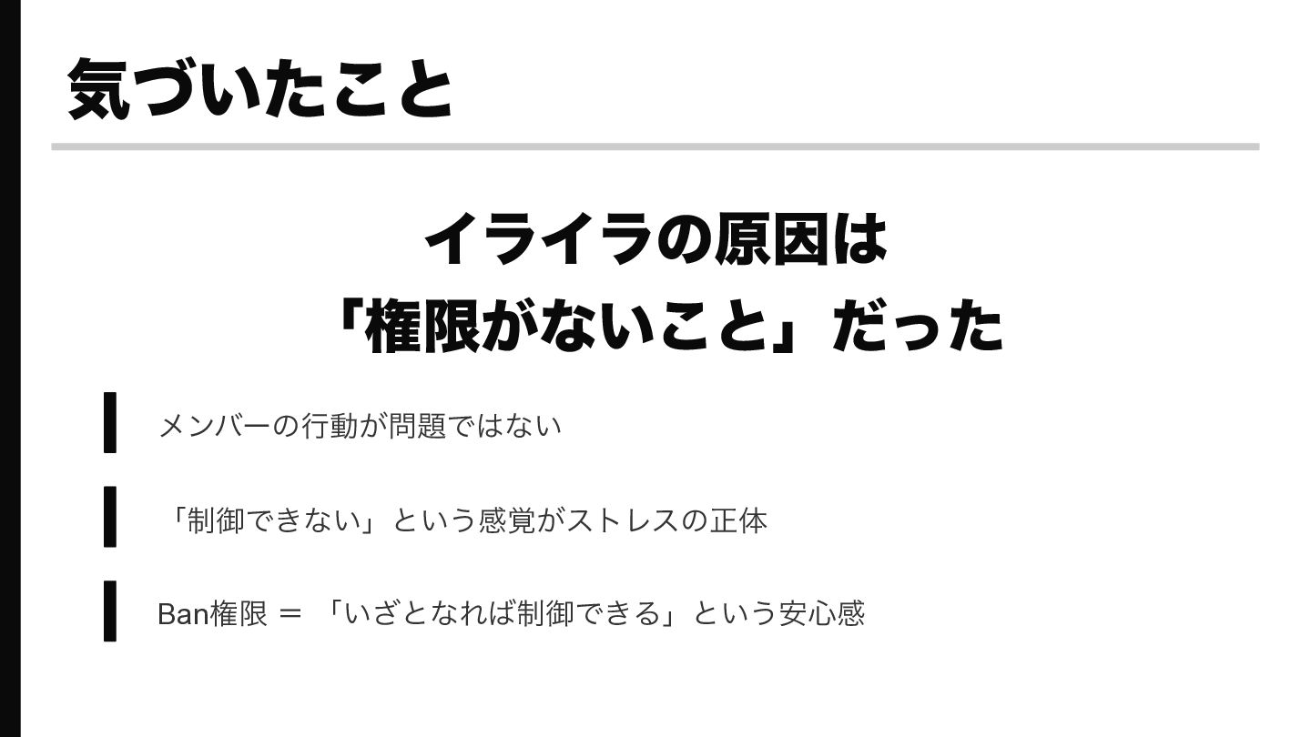 その後Ban権限(管理者権限)を得たら、メンバーの行動は何も変わっていないのに「いつでも消せるし、まあいいか」という精神的余裕が生まれ、イライラがなくなった、という実体験の話です。