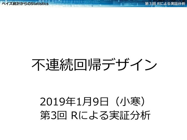 ベイズ統計からのStatistics 第3回 Rによる実証分析 不連続回帰デザイン 2019年1⽉9⽇(⼩寒) 第3回 Rによる実証分析