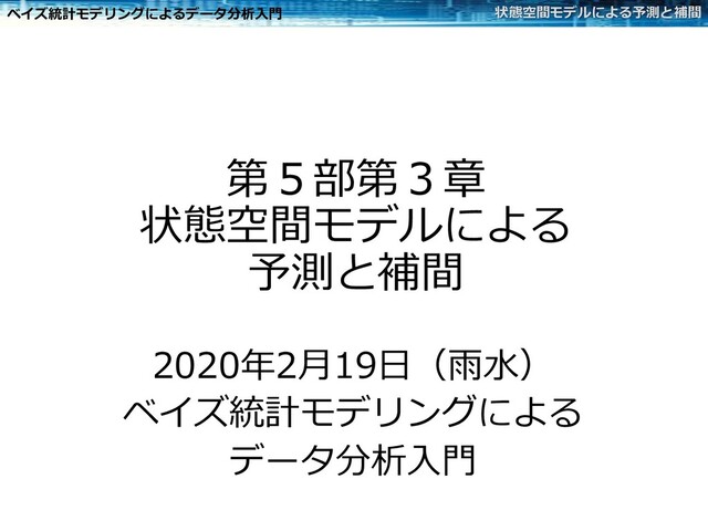 ベイズ統計モデリングによるデータ分析⼊⾨ 状態空間モデルによる予測と補間 第5部第3章 状態空間モデルによる 予測と補間 2020年2⽉19⽇(⾬⽔) ベイズ統計モデリングによる データ分析⼊⾨
