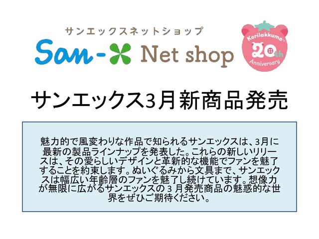 魅力的で風変わりな作品で知られるサンエックスは、3月に最新の製品ラインナップを発表した。これらの新しいリリースは、その愛らしいデザインと革新的な機能でファンを魅了することを約束します。ぬいぐるみから文具まで、サンエックスは幅広い年齢層のファンを魅了し続けています。想像力が無限に広がる、サンエックスの 3 月リリースの製品の魅力的な世界を掘り下げていきますので、ご期待ください。