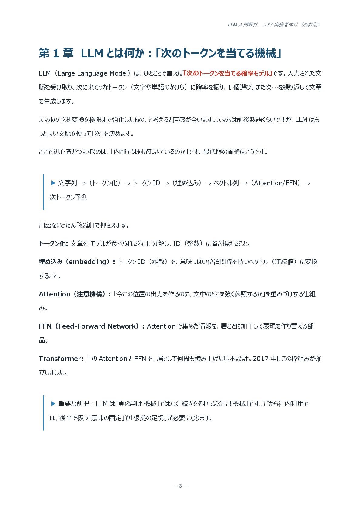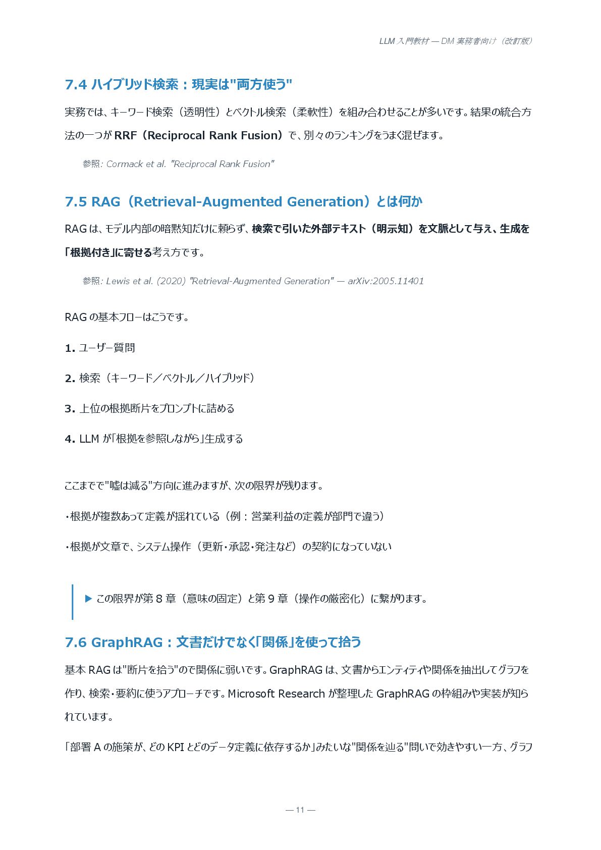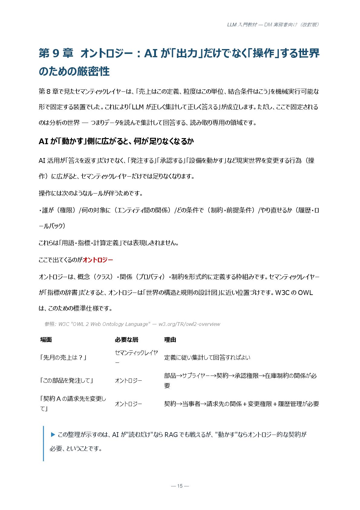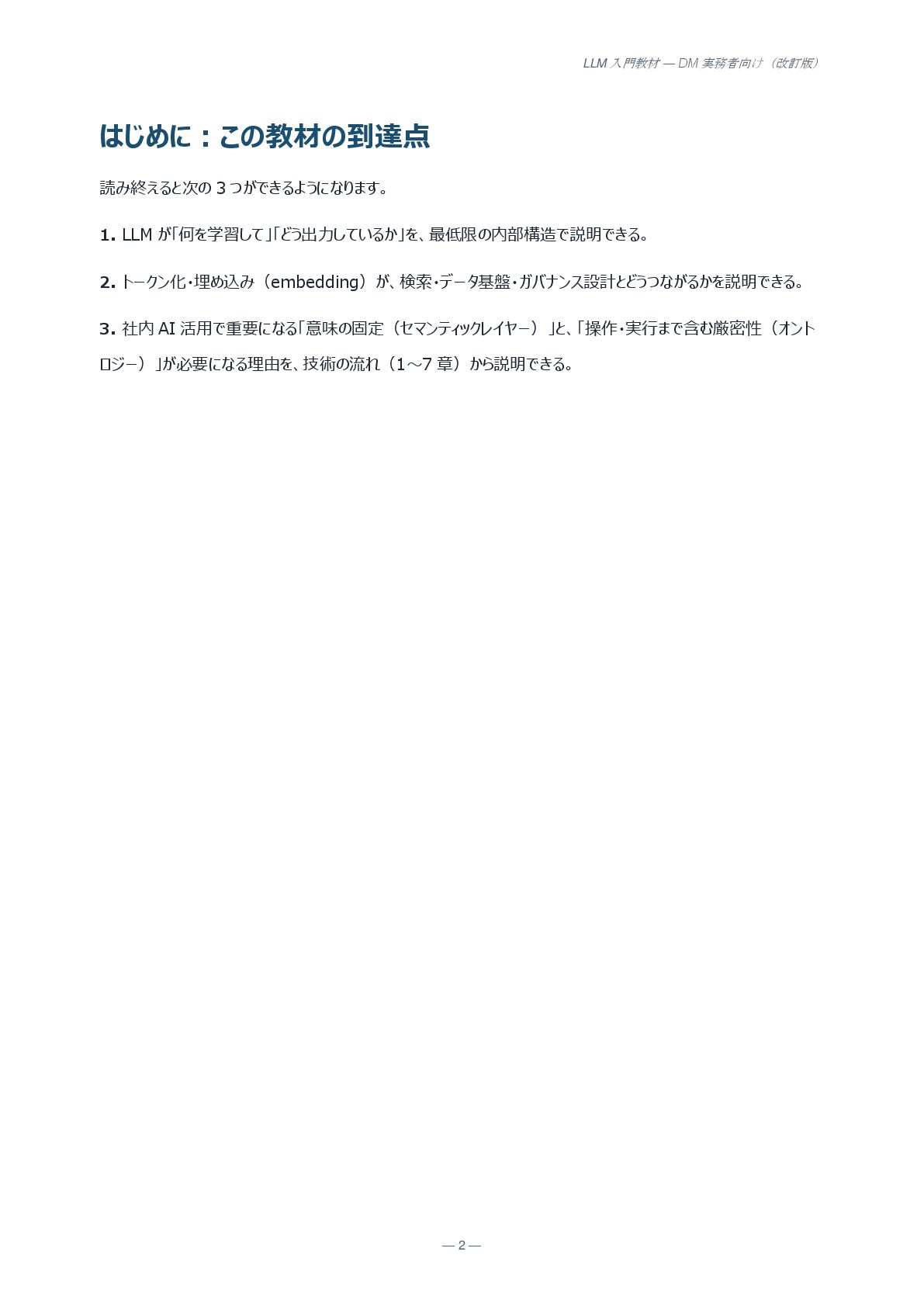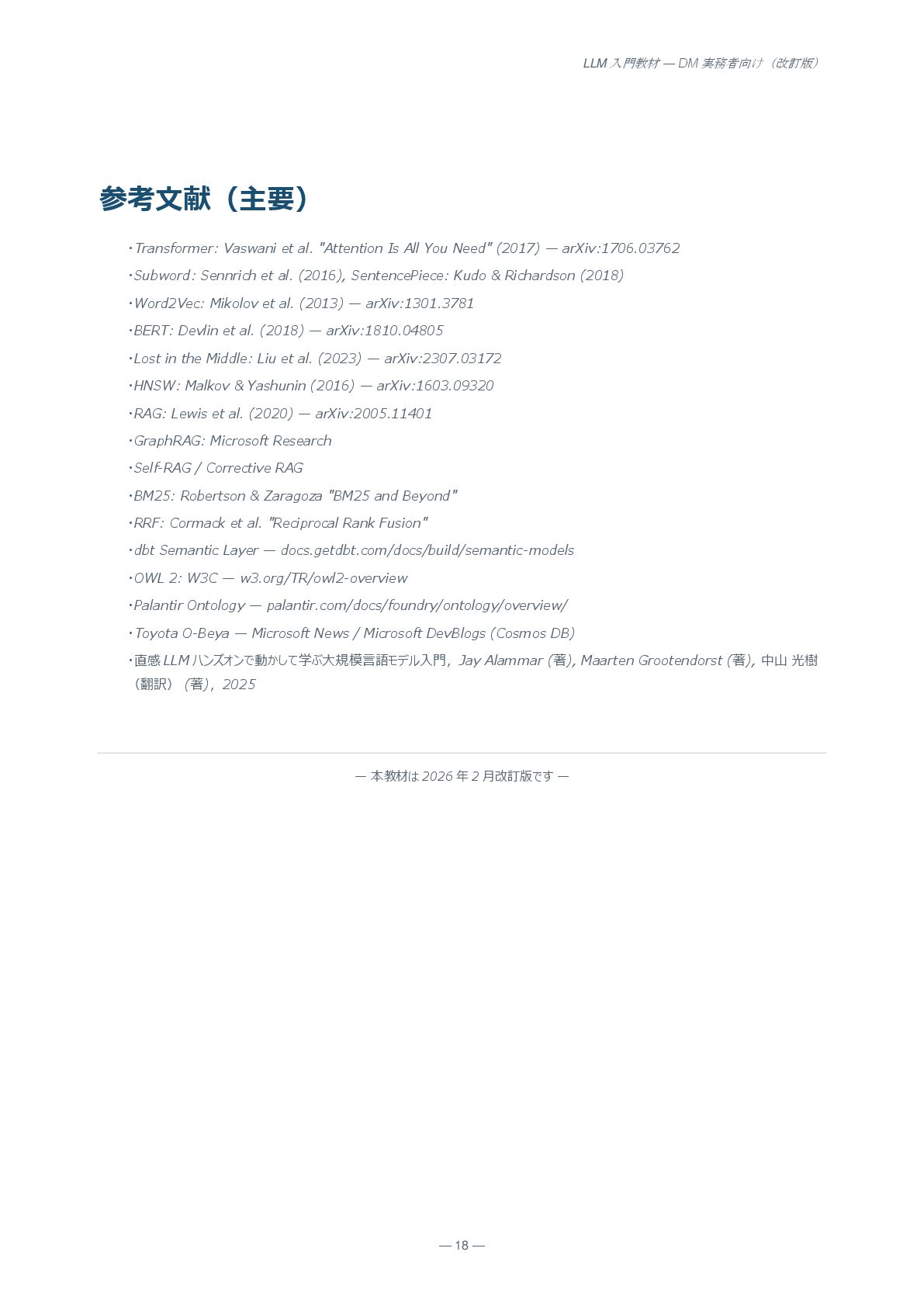 Vaswani et al. "Attention Is All You Need" (2017) — arXiv:1706.03762 ・Subword: Sennrich et al. (2016), SentencePiece: Kudo & Richardson (2018) ・Word2Vec: Mikolov et al. (2013) — arXiv:1301.3781 ・BERT: Devlin et al. (2018) — arXiv:1810.04805 ・Lost in the Middle: Liu et al. (2023) — arXiv:2307.03172 ・HNSW: Malkov & Yashunin (2016) — arXiv:1603.09320 ・RAG: Lewis et al. (2020) — arXiv:2005.11401 ・GraphRAG: Microsoft Research ・Self-RAG / Corrective RAG ・BM25: Robertson & Zaragoza "BM25 and Beyond" ・RRF: Cormack et al. "Reciprocal Rank Fusion" ・dbt Semantic Layer — docs.getdbt.com/docs/build/semantic-models ・OWL 2: W3C — w3.org/TR/owl2-overview ・Palantir Ontology — palantir.com/docs/foundry/ontology/overview/ ・Toyota O-Beya — Microsoft News / Microsoft DevBlogs (Cosmos DB) ・直感 LLM ハンズオンで動かして学ぶ大規模言語モデル入門,Jay Alammar (著), Maarten Grootendorst (著), 中山 光樹 (翻訳) (著),2025 — 本教材は 2026 年 2 月改訂版です —