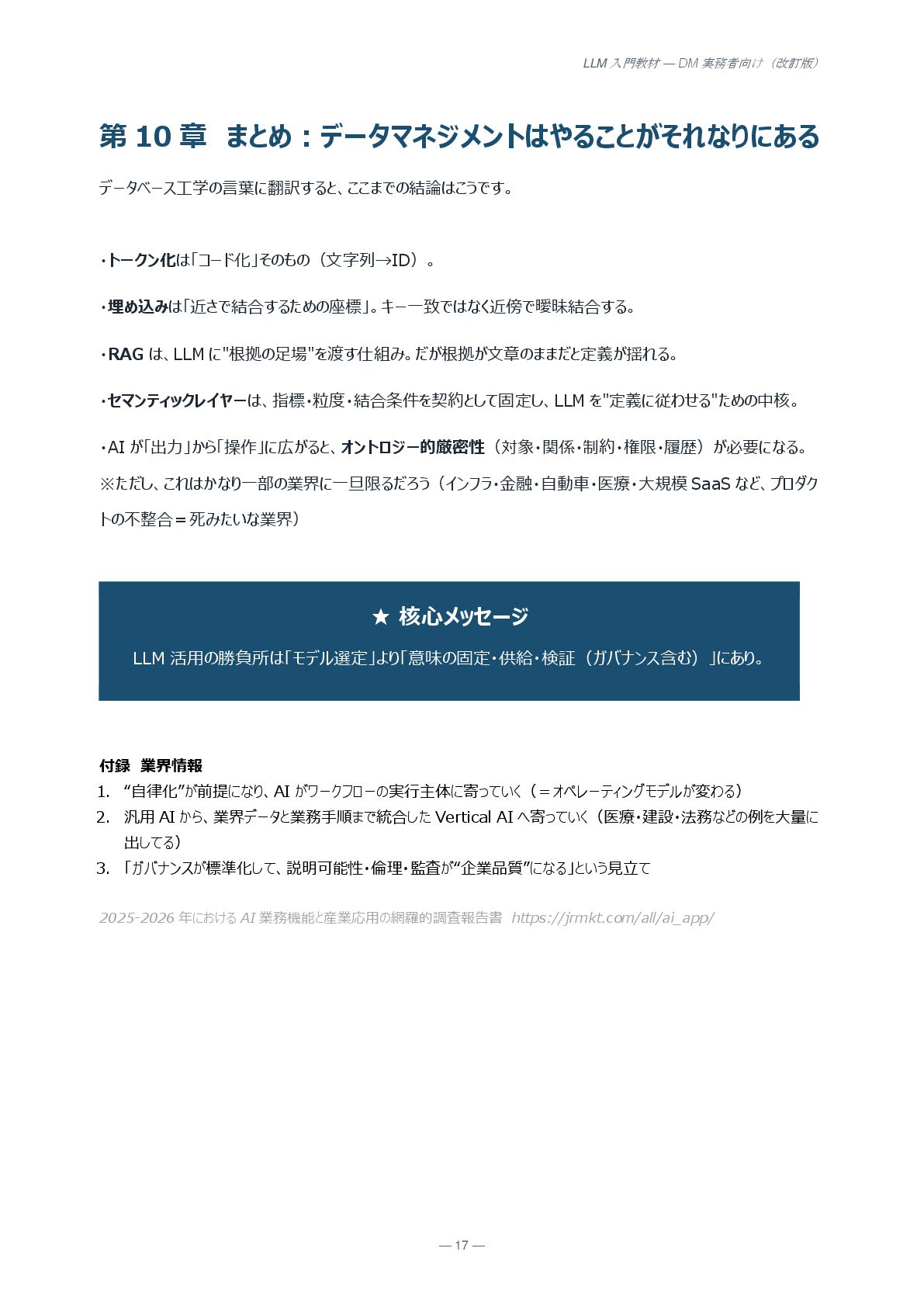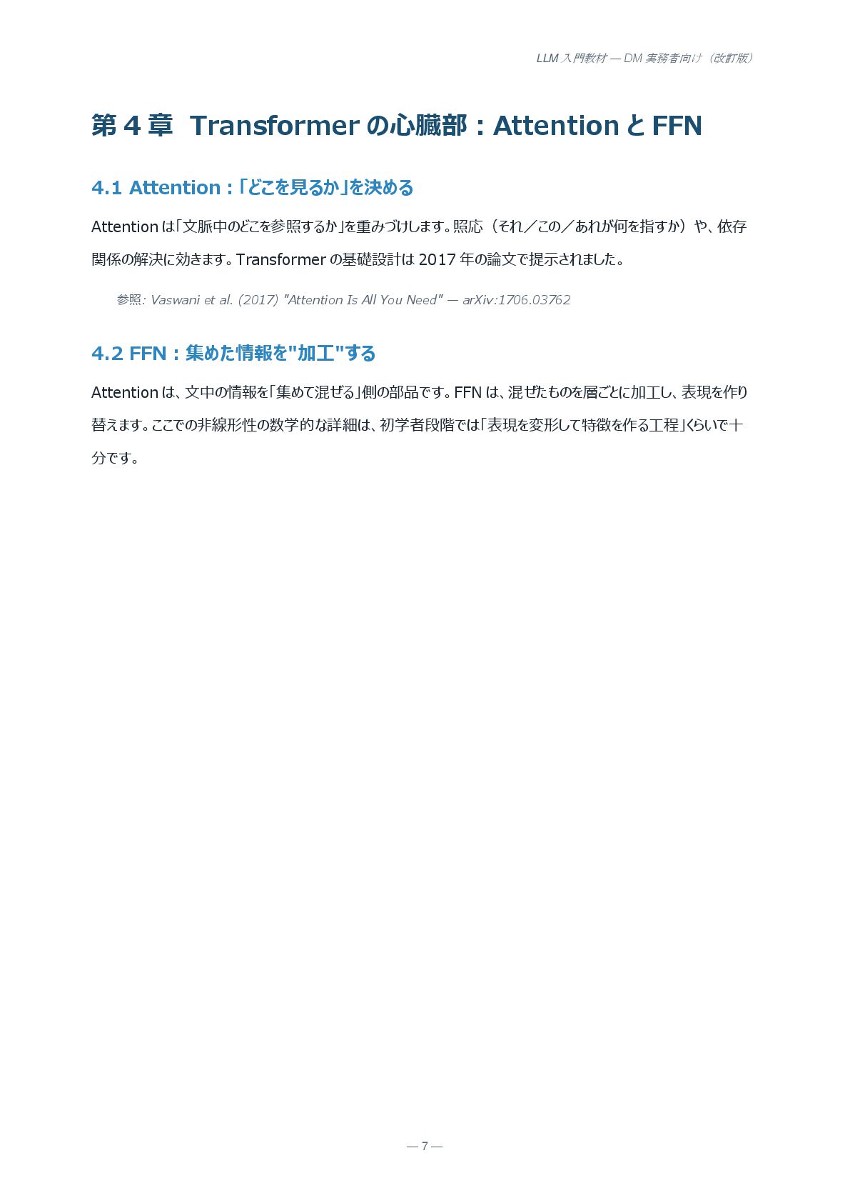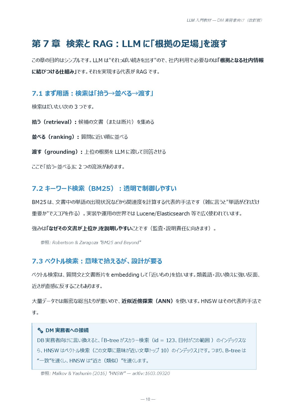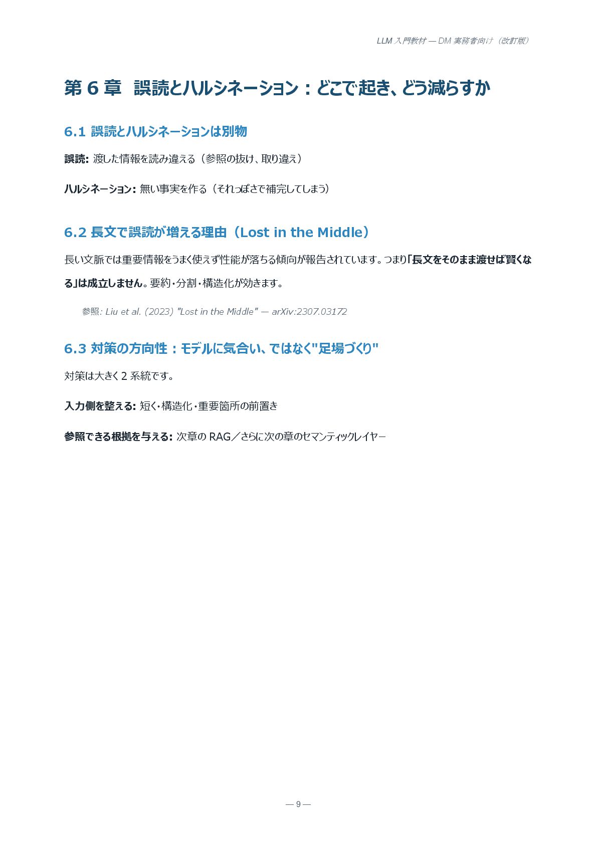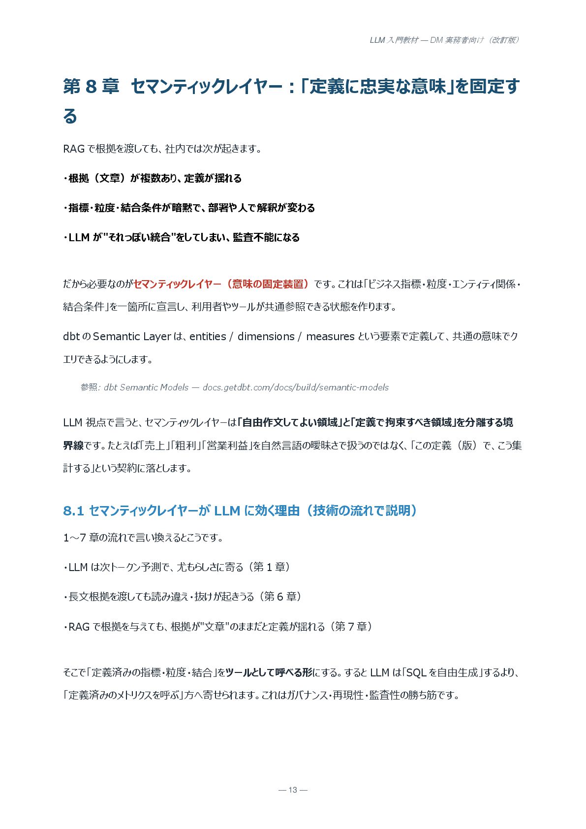 Vaswani et al. "Attention Is All You Need" (2017) — arXiv:1706.03762 ・Subword: Sennrich et al. (2016), SentencePiece: Kudo & Richardson (2018) ・Word2Vec: Mikolov et al. (2013) — arXiv:1301.3781 ・BERT: Devlin et al. (2018) — arXiv:1810.04805 ・Lost in the Middle: Liu et al. (2023) — arXiv:2307.03172 ・HNSW: Malkov & Yashunin (2016) — arXiv:1603.09320 ・RAG: Lewis et al. (2020) — arXiv:2005.11401 ・GraphRAG: Microsoft Research ・Self-RAG / Corrective RAG ・BM25: Robertson & Zaragoza "BM25 and Beyond" ・RRF: Cormack et al. "Reciprocal Rank Fusion" ・dbt Semantic Layer — docs.getdbt.com/docs/build/semantic-models ・OWL 2: W3C — w3.org/TR/owl2-overview ・Palantir Ontology — palantir.com/docs/foundry/ontology/overview/ ・Toyota O-Beya — Microsoft News / Microsoft DevBlogs (Cosmos DB) ・直感 LLM ハンズオンで動かして学ぶ大規模言語モデル入門,Jay Alammar (著), Maarten Grootendorst (著), 中山 光樹 (翻訳) (著),2025 — 本教材は 2026 年 2 月改訂版です —