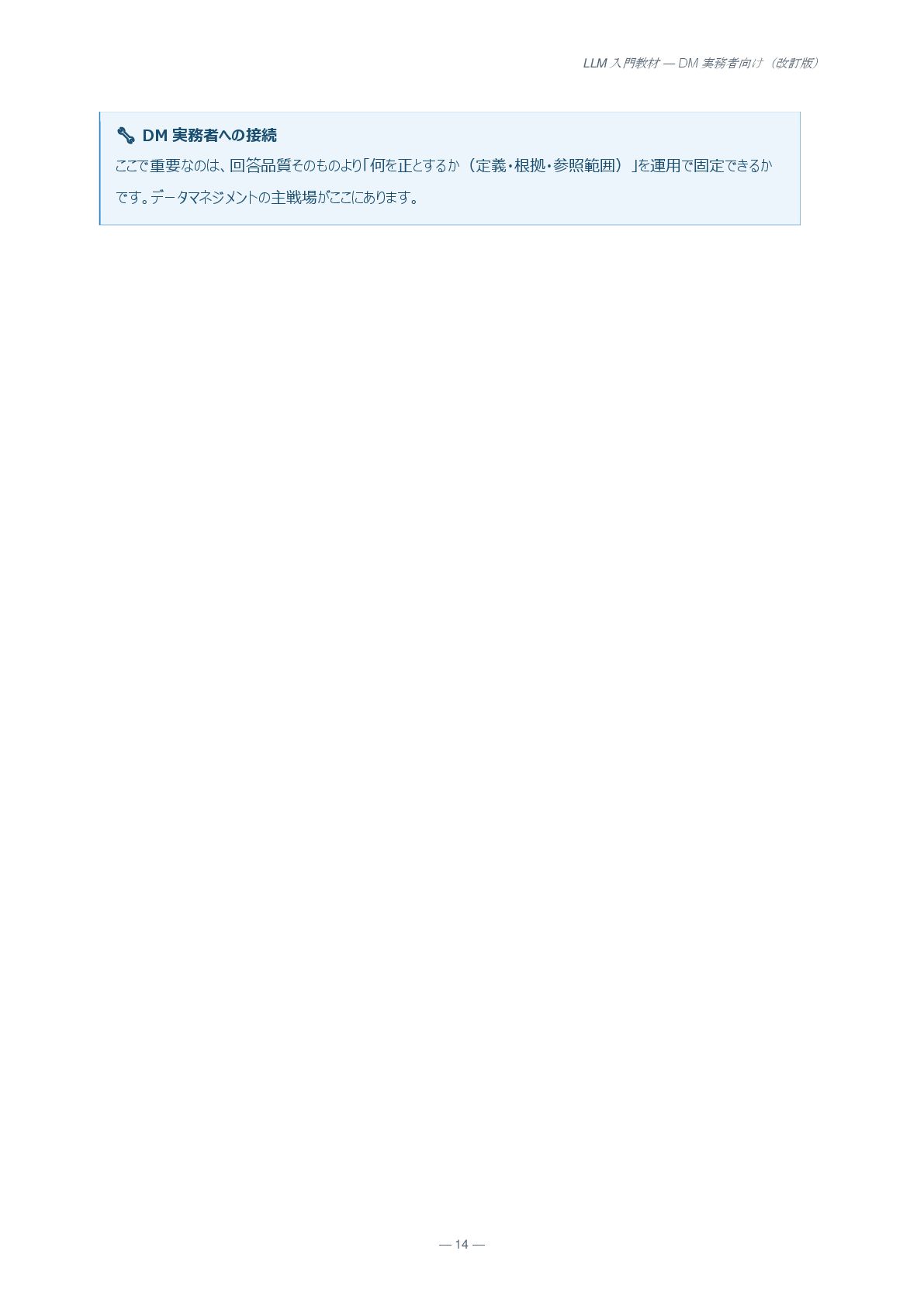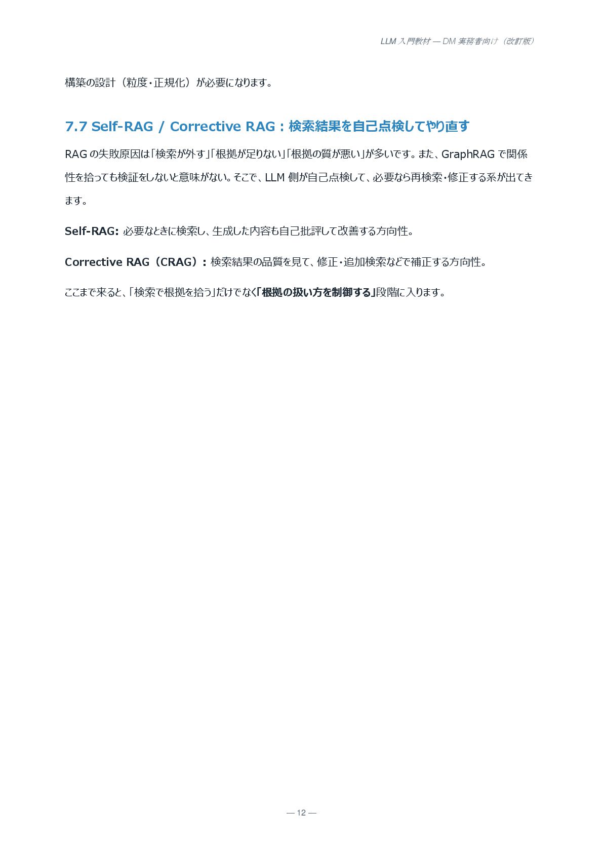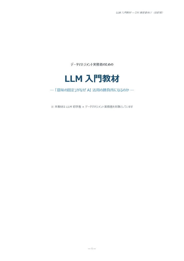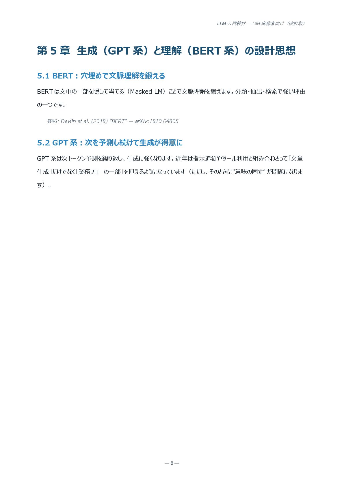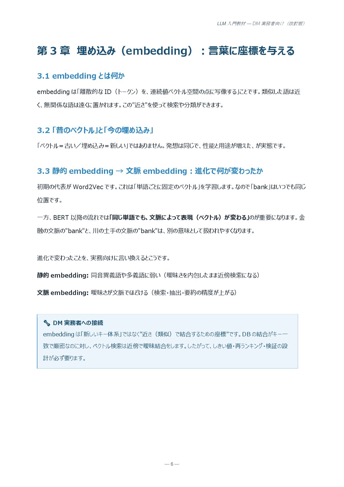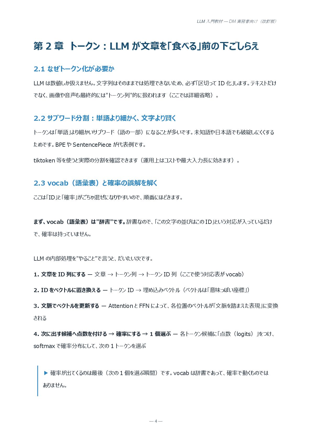 Vaswani et al. "Attention Is All You Need" (2017) — arXiv:1706.03762 ・Subword: Sennrich et al. (2016), SentencePiece: Kudo & Richardson (2018) ・Word2Vec: Mikolov et al. (2013) — arXiv:1301.3781 ・BERT: Devlin et al. (2018) — arXiv:1810.04805 ・Lost in the Middle: Liu et al. (2023) — arXiv:2307.03172 ・HNSW: Malkov & Yashunin (2016) — arXiv:1603.09320 ・RAG: Lewis et al. (2020) — arXiv:2005.11401 ・GraphRAG: Microsoft Research ・Self-RAG / Corrective RAG ・BM25: Robertson & Zaragoza "BM25 and Beyond" ・RRF: Cormack et al. "Reciprocal Rank Fusion" ・dbt Semantic Layer — docs.getdbt.com/docs/build/semantic-models ・OWL 2: W3C — w3.org/TR/owl2-overview ・Palantir Ontology — palantir.com/docs/foundry/ontology/overview/ ・Toyota O-Beya — Microsoft News / Microsoft DevBlogs (Cosmos DB) ・直感 LLM ハンズオンで動かして学ぶ大規模言語モデル入門,Jay Alammar (著), Maarten Grootendorst (著), 中山 光樹 (翻訳) (著),2025 — 本教材は 2026 年 2 月改訂版です —