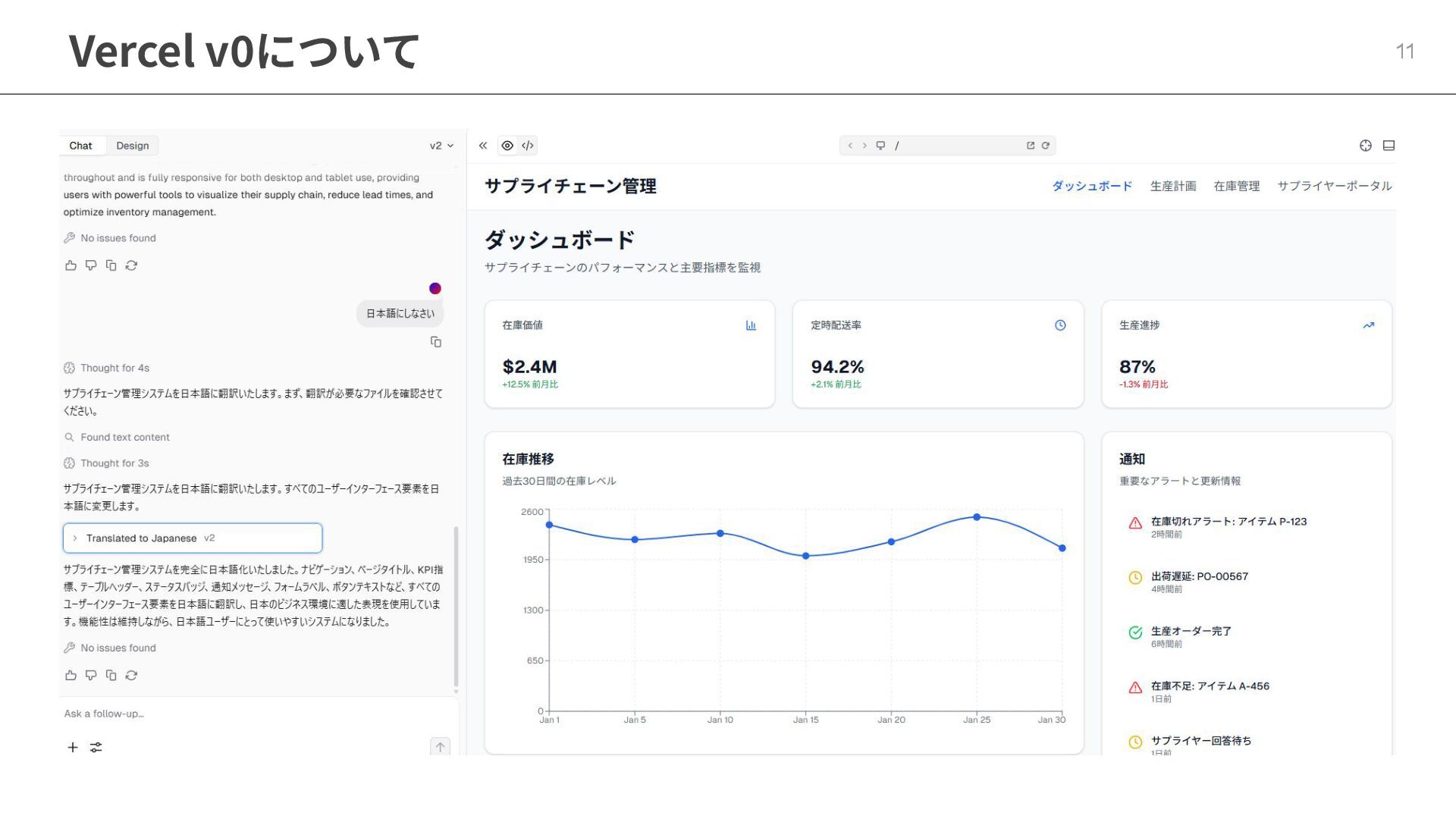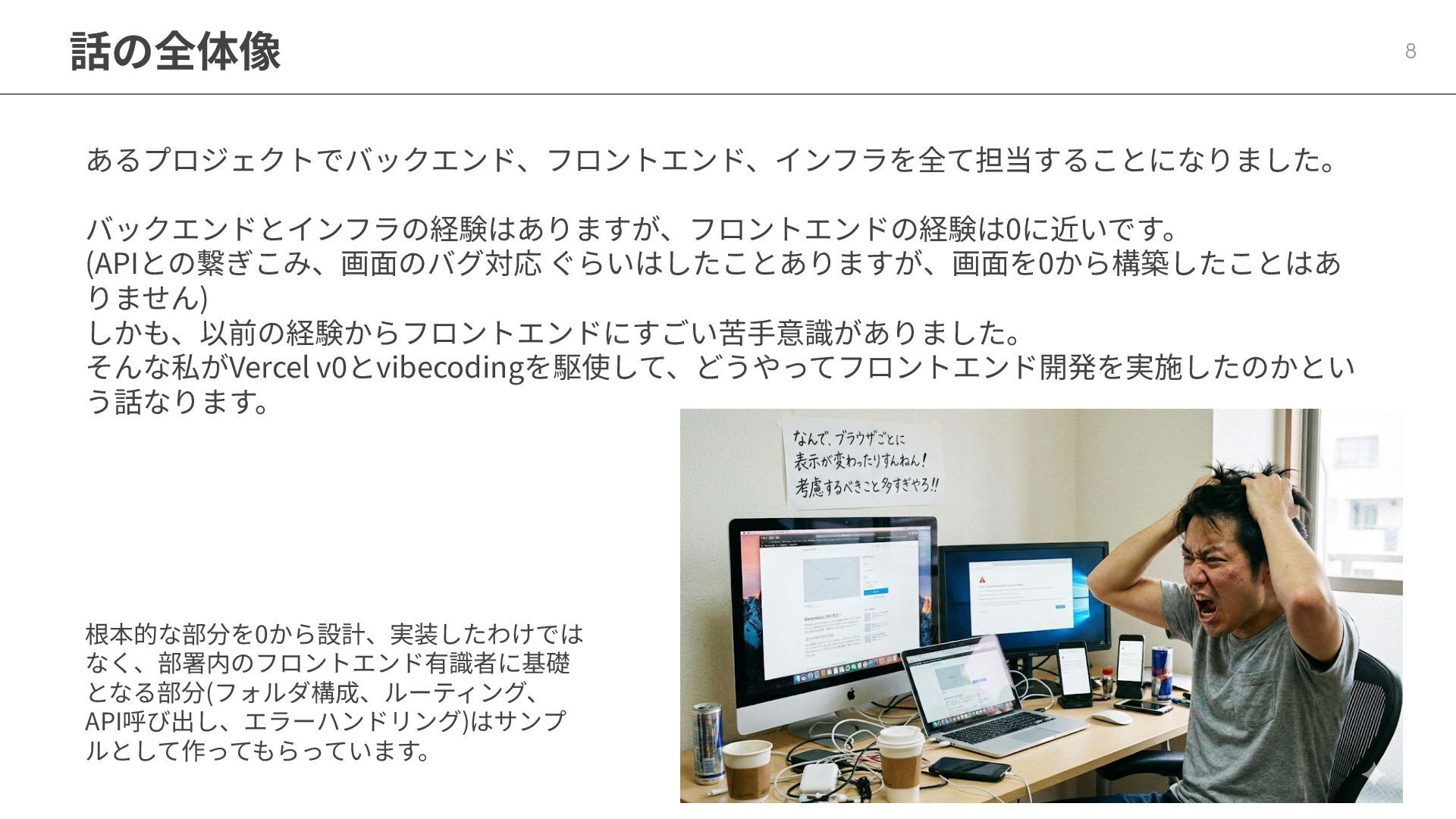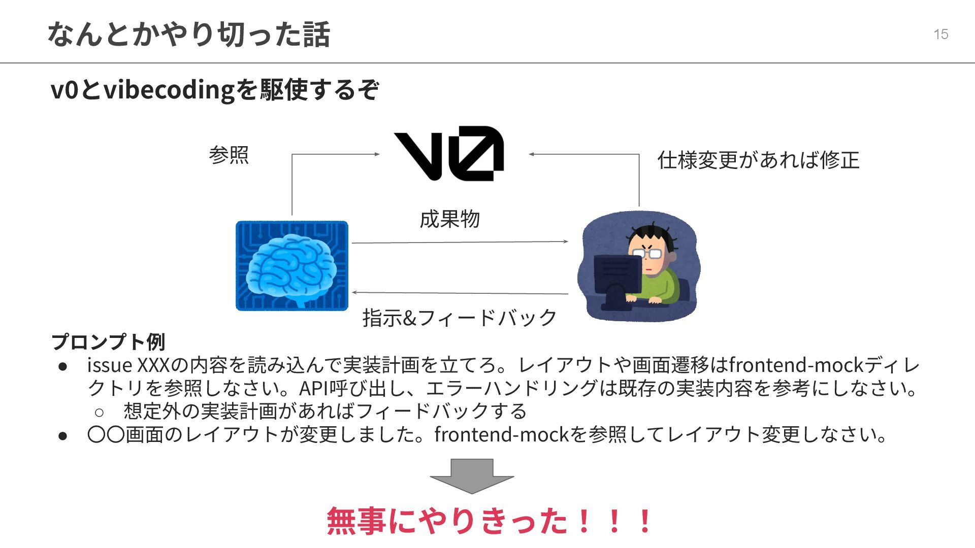 フロントエンド開発経験がほぼゼロのエンジニアが、Vercel v0と生成AI(vibecoding)を駆使して、フルスタック案件を完遂した奮闘記です。 「生成されたコードをmockとして扱い、実装コードに落とし込む具体的なワークフロー」まで、AIを活用して技術的なギャップを埋めるための実践的なノウハウを公開しています。フロントエンドに苦手意識がある方や、生成AIを実開発に組み込みたい方におすすめの事例です。