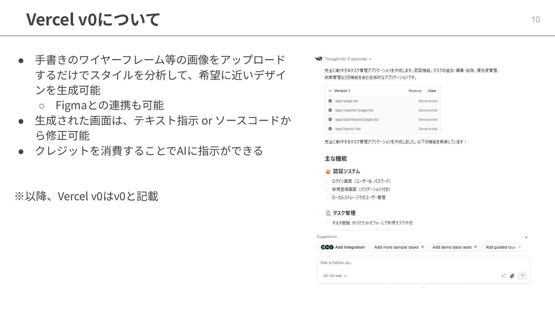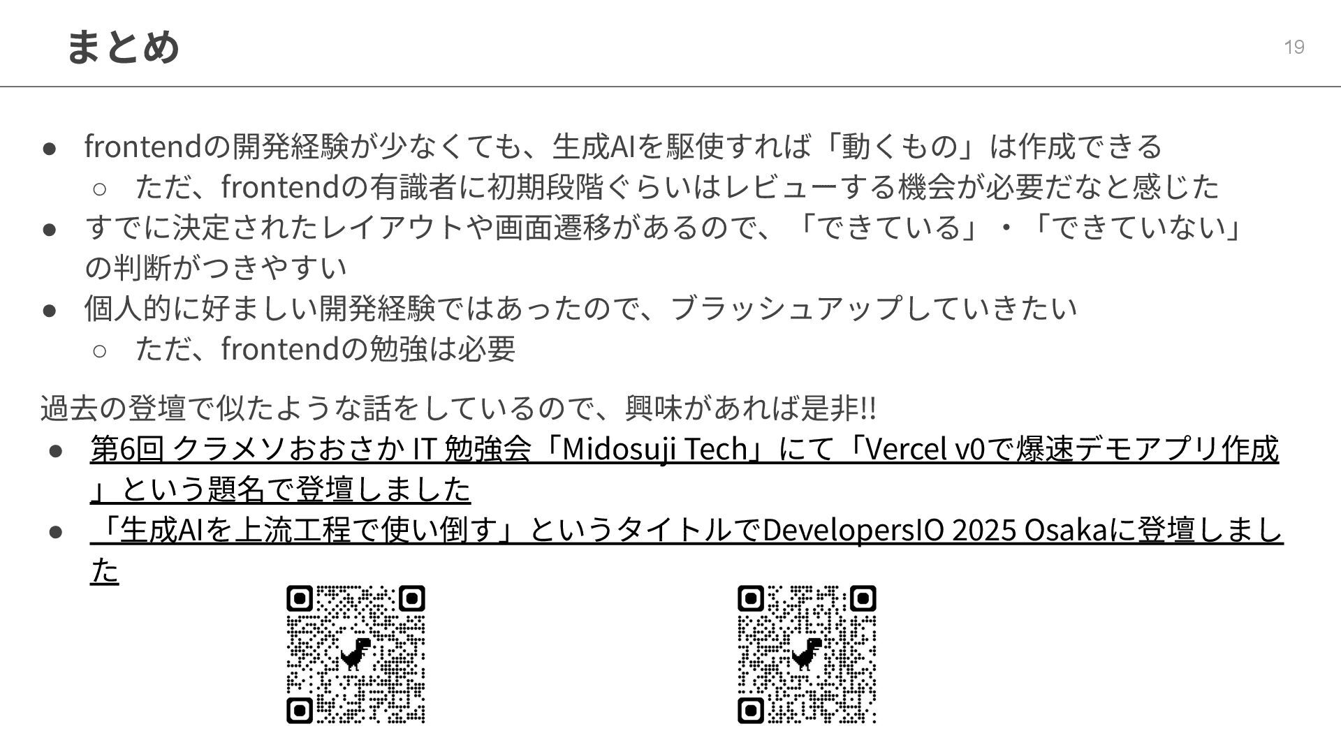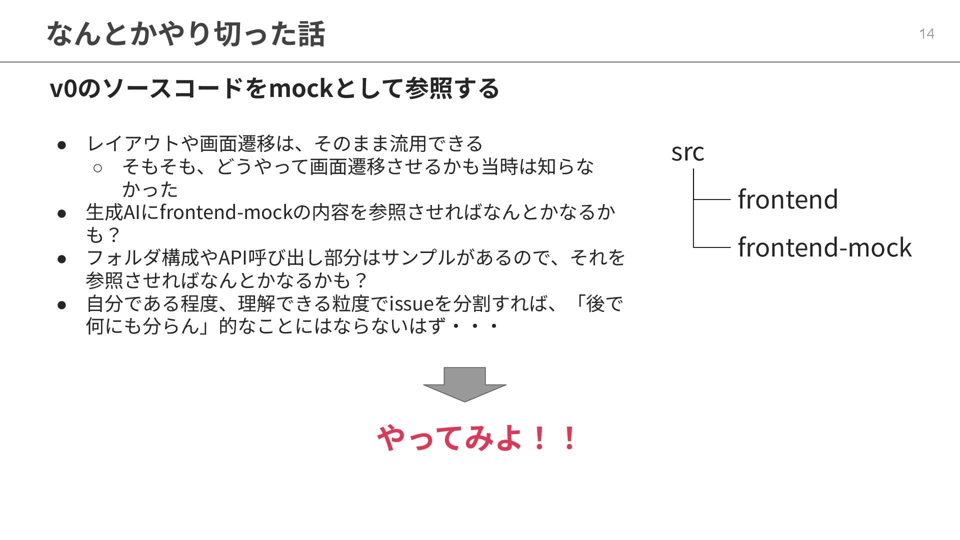 フロントエンド開発経験がほぼゼロのエンジニアが、Vercel v0と生成AI(vibecoding)を駆使して、フルスタック案件を完遂した奮闘記です。 「生成されたコードをmockとして扱い、実装コードに落とし込む具体的なワークフロー」まで、AIを活用して技術的なギャップを埋めるための実践的なノウハウを公開しています。フロントエンドに苦手意識がある方や、生成AIを実開発に組み込みたい方におすすめの事例です。