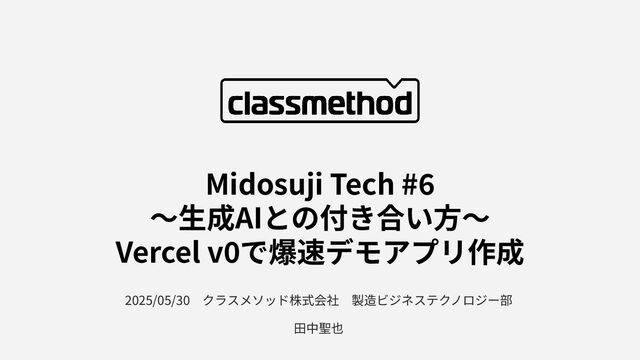 2025/05/30 クラスメソッド株式会社 製造ビジネステクノロジー部 ⽥中聖也 Midosuji Tech #6 〜⽣成AIとの付き合い⽅〜 Vercel v0で爆速デモアプリ作成