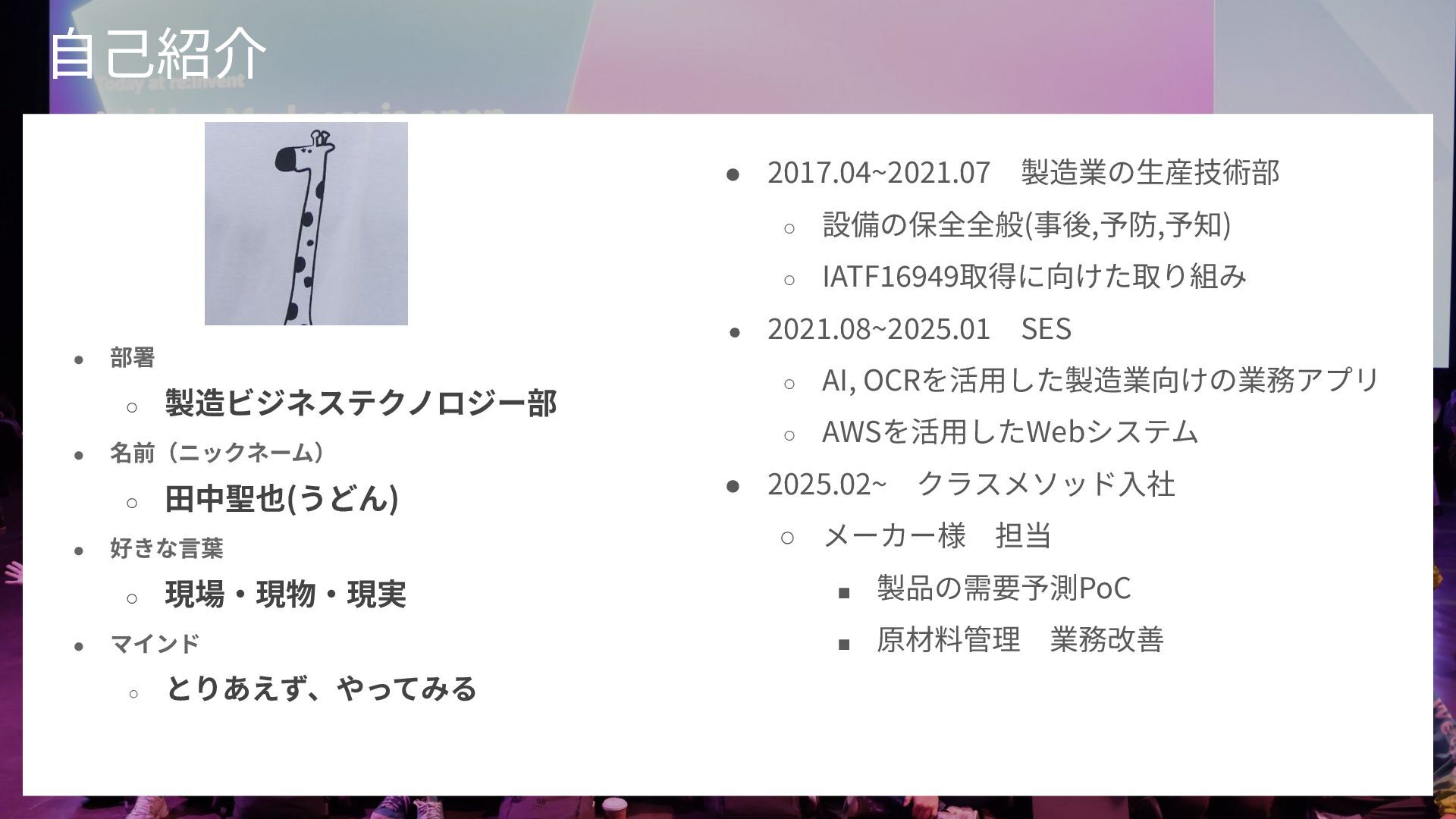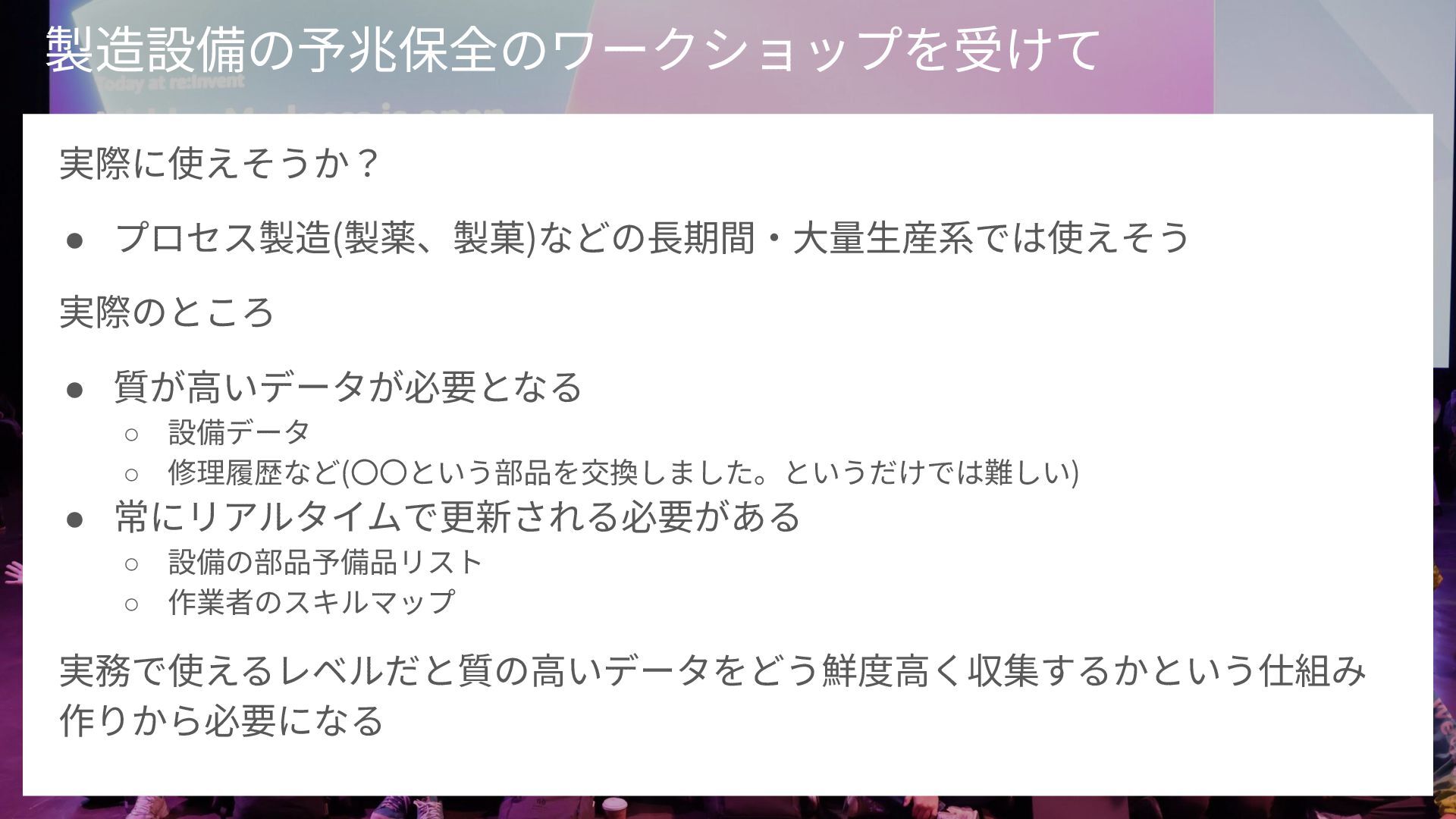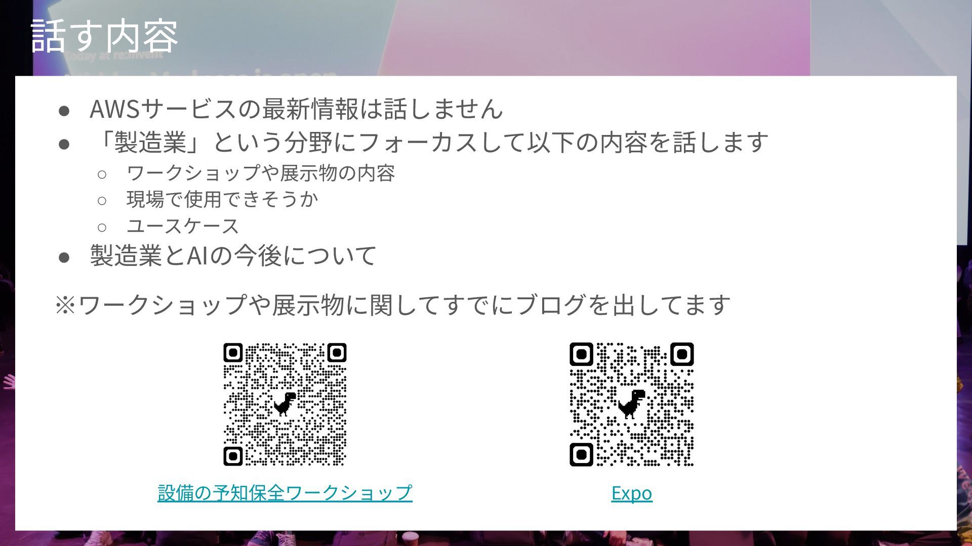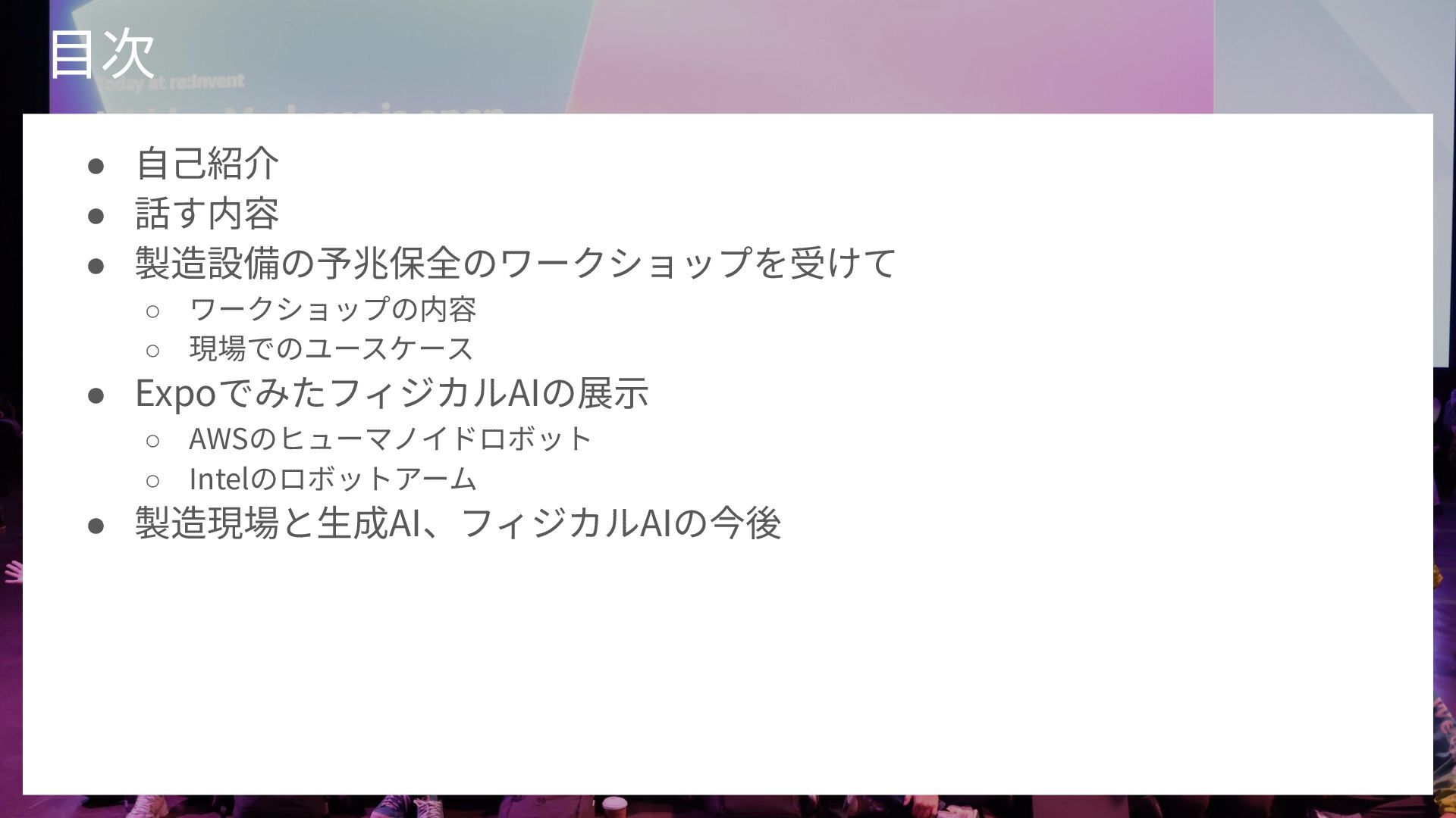 概要: 2025年2月開催のクラスメソッド主催イベント「re:Growth 2025 大阪」での登壇資料です。元製造業エンジニアの視点から、AWS re:InventのワークショップやExpoで展示されていた「製造業における生成AIとフィジカルAI」の最新動向と、現場での実用性について解説しています。