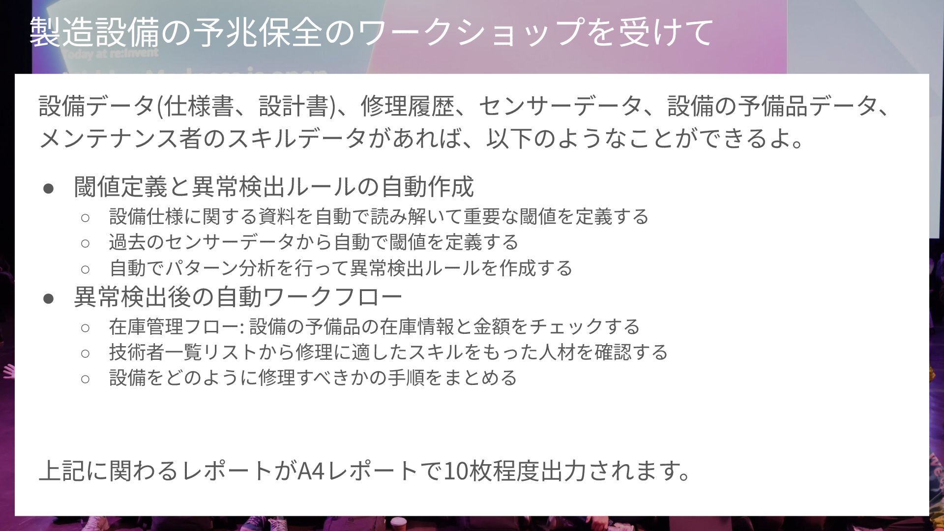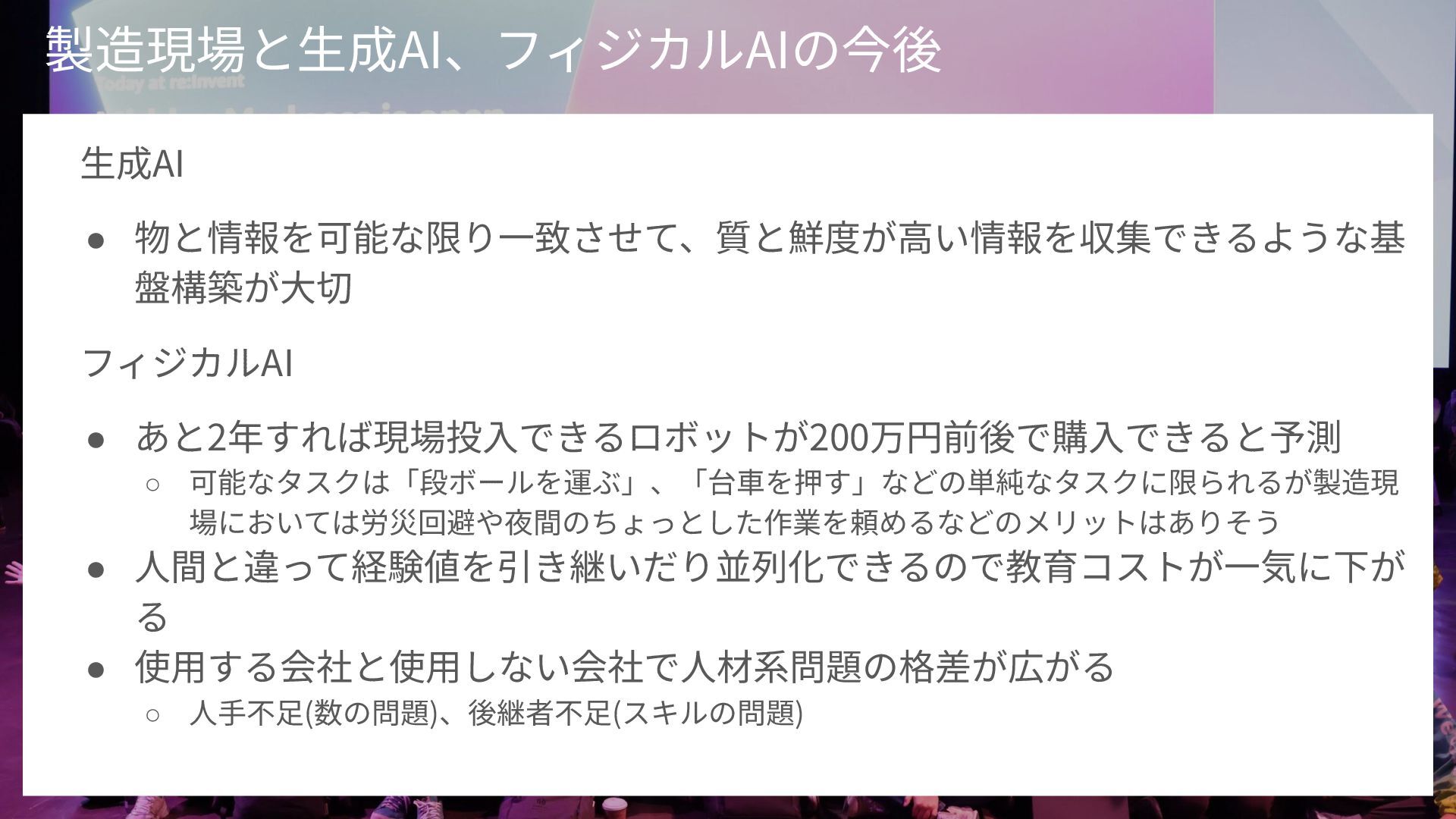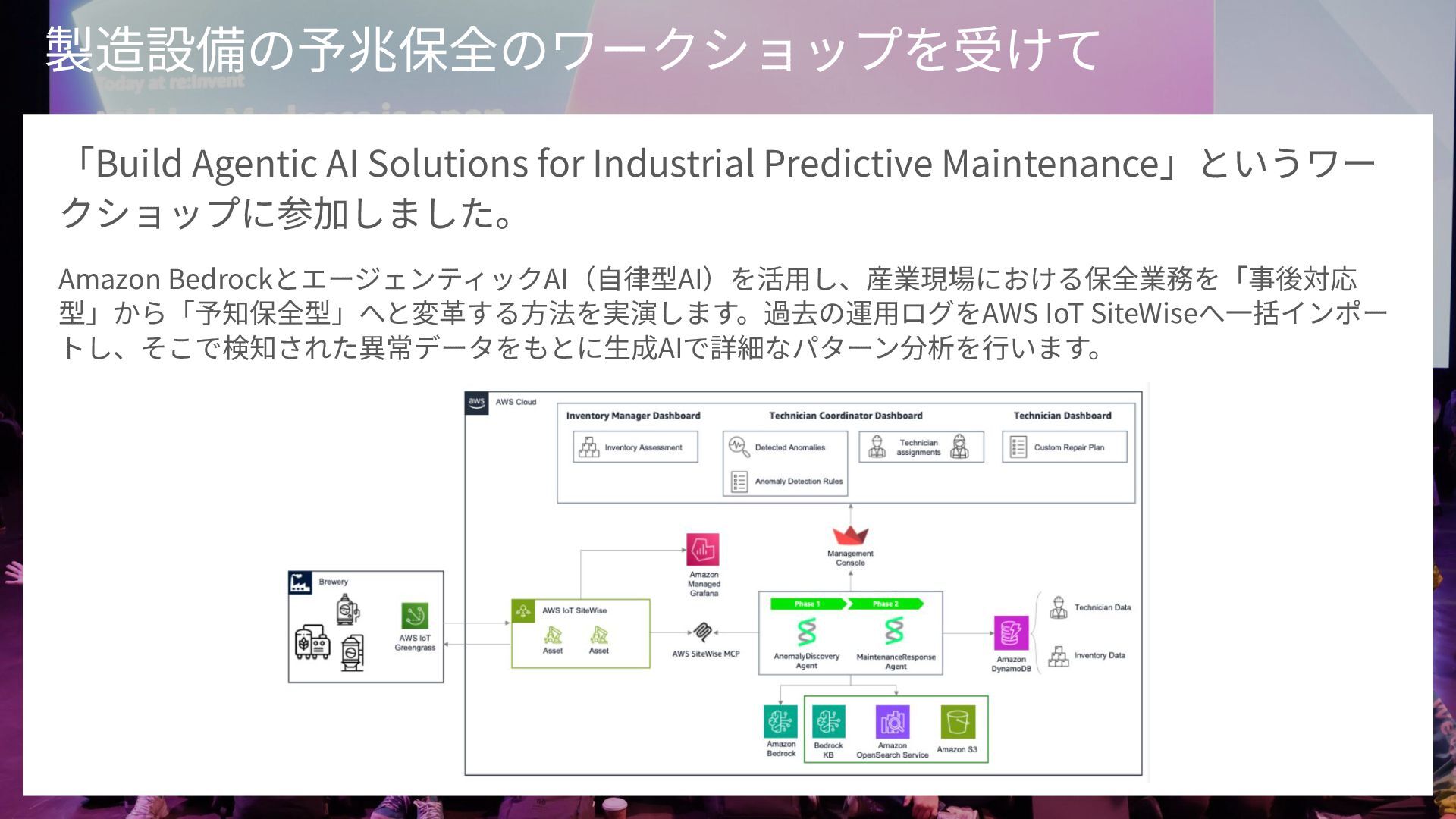 キーワード: 製造業, 生成AI, AWS, Amazon Bedrock, IoT SiteWise, 予知保全, フィジカルAI, ロボティクス, re:Invent, re:Growth