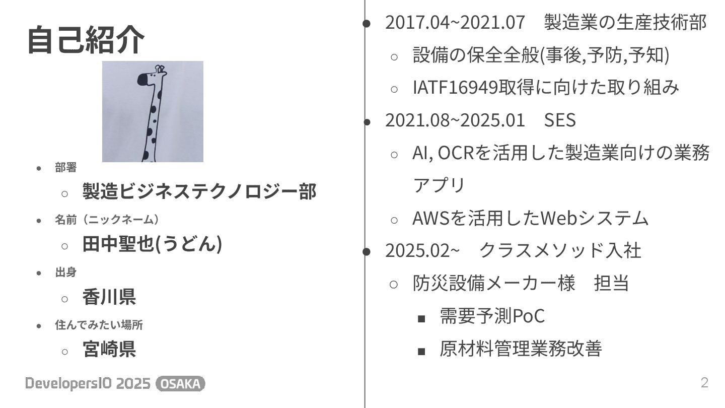 ◦ AI, OCRを活⽤した製造業向けの業務 アプリ ◦ AWSを活⽤したWebシステム • 2025.02~ クラスメソッド⼊社 ◦ 防災設備メーカー様 担当 ▪ 需要予測PoC ▪ 原材料管理業務改善 • 部署 ◦ 製造ビジネステクノロジー部 • 名前(ニックネーム) ◦ ⽥中聖也(うどん) • 出⾝ ◦ ⾹川県 • 住んでみたい場所 ◦ 宮崎県