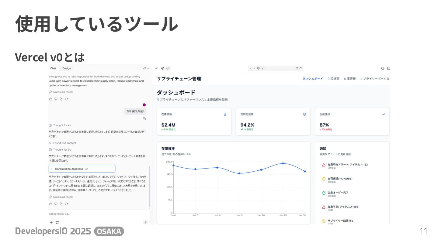 使⽤しているツール 10 Vercel v0とは • ⼿書きのワイヤーフレーム等の画像をアッ プロードするだけでスタイルを分析して、 希望に近いデザインを⽣成可能 • ⽣成された画⾯は、テキスト指⽰