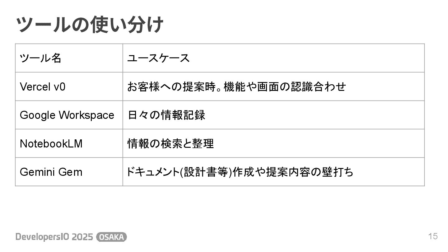 ツールの使い分け 15 ツール名 ユースケース Vercel v0 お客様への提案時。機能や画面の認識合わせ Google Workspace 日々の情報記録