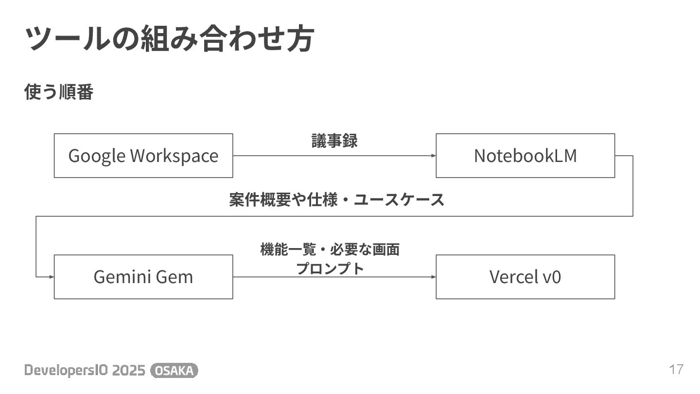 ツールの組み合わせ⽅ 17 使う順番 Google Workspace NotebookLM Gemini Gem Vercel v0