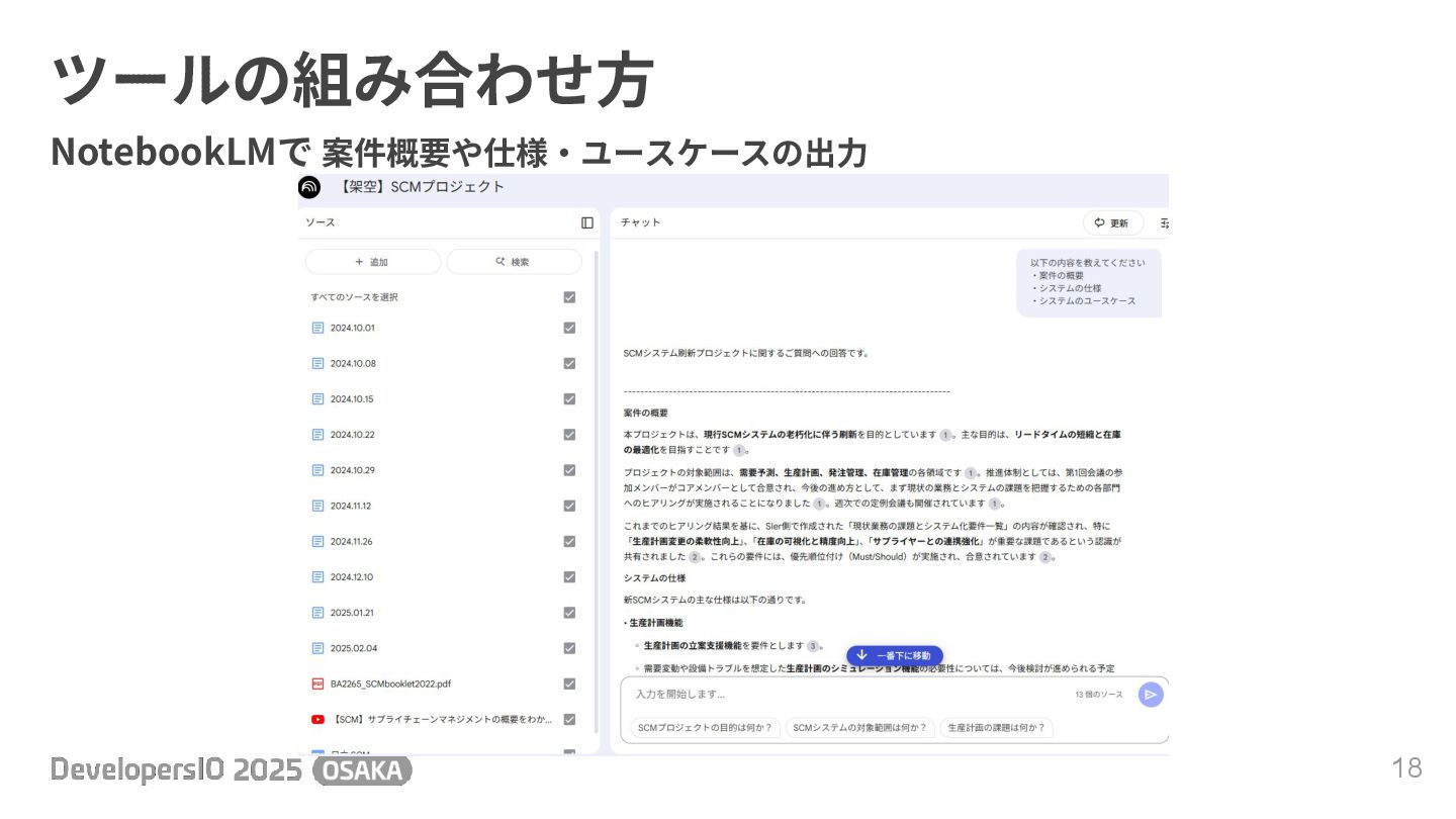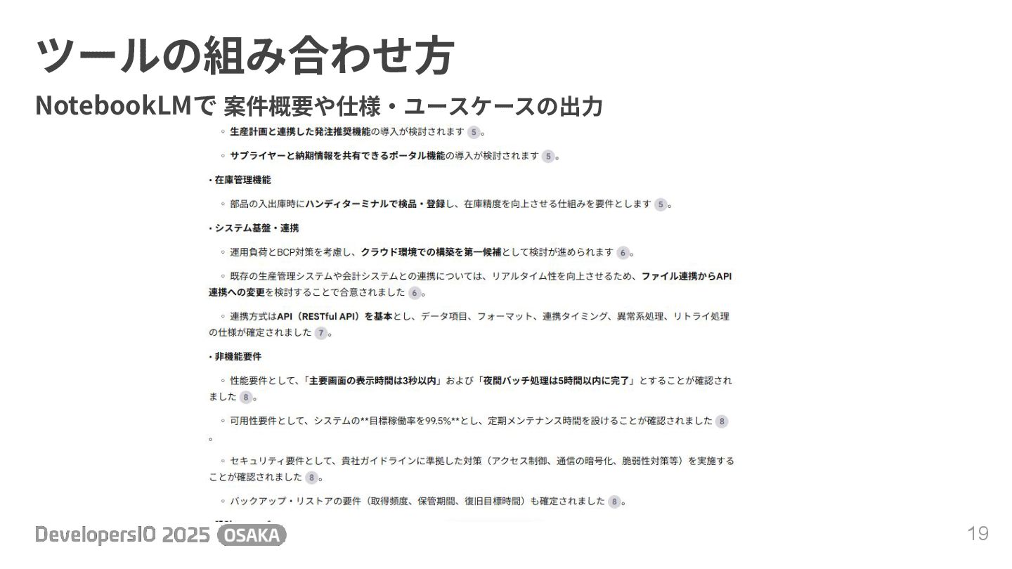 ツールの組み合わせ⽅ 18 NotebookLMで 案件概要や仕様‧ユースケースの出⼒
