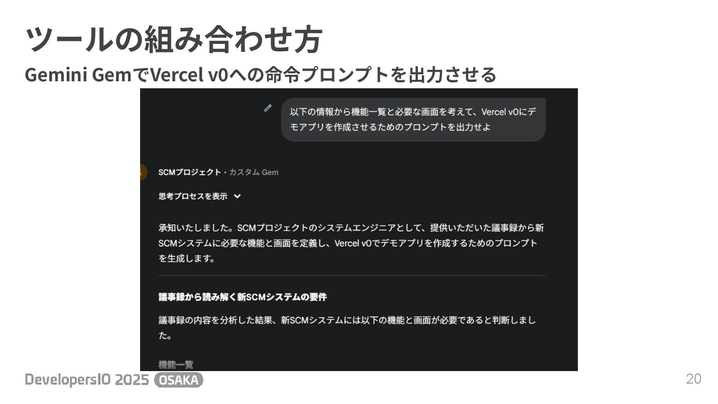 ツールの組み合わせ⽅ 20 Gemini GemでVercel v0への命令プロンプトを出⼒させる