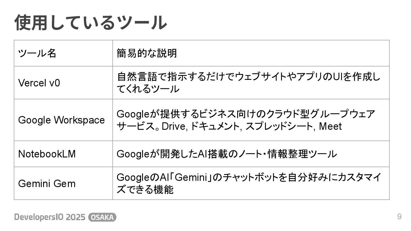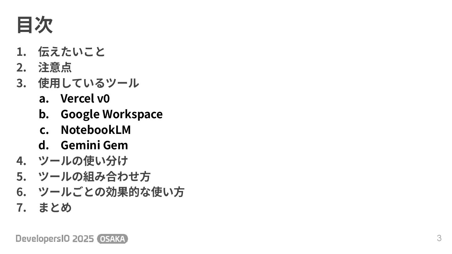 v0 b. Google Workspace c. NotebookLM d. Gemini Gem 4. ツールの使い分け 5. ツールの組み合わせ⽅ 6. ツールごとの効果的な使い⽅ 7. まとめ