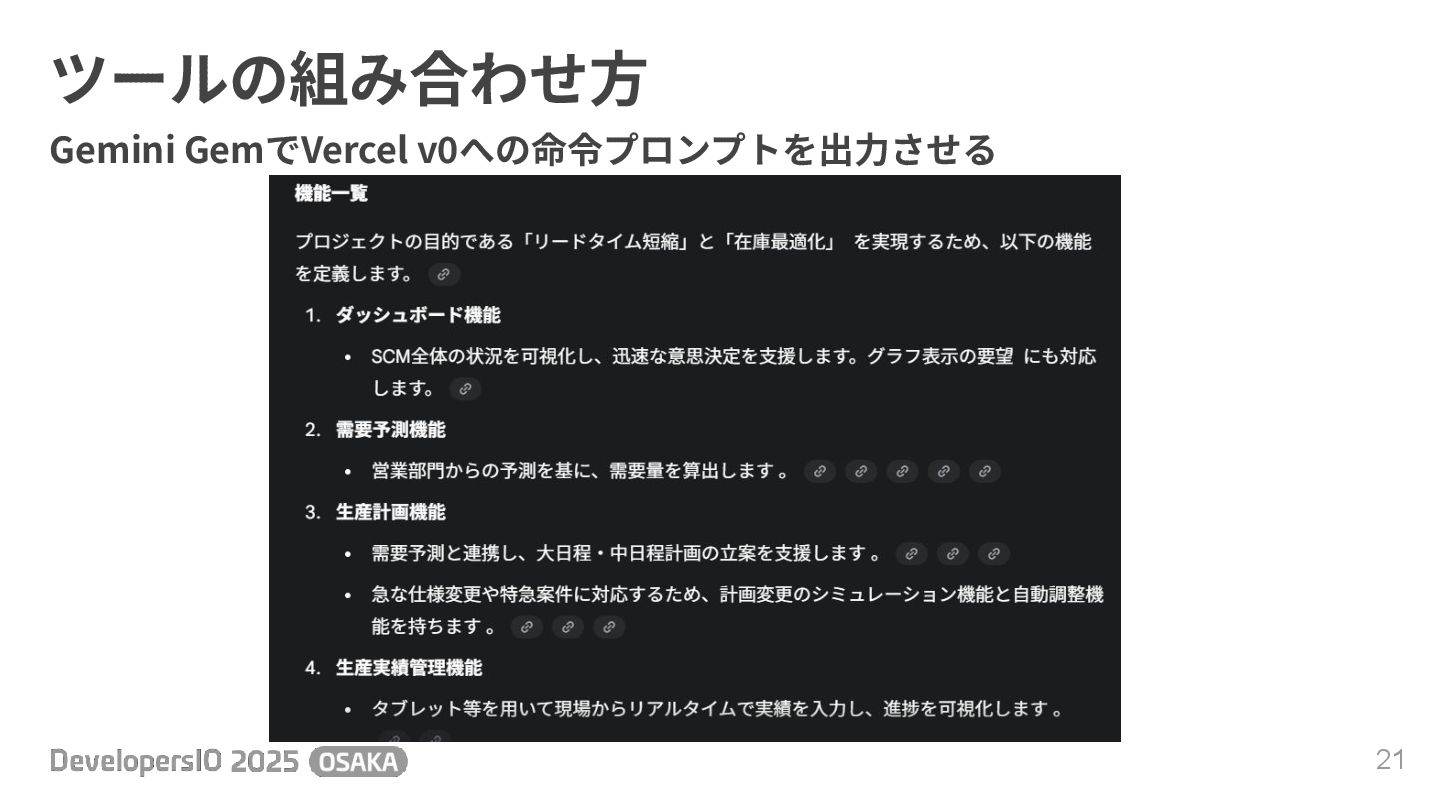 ツールの組み合わせ⽅ 21 Gemini GemでVercel v0への命令プロンプトを出⼒させる