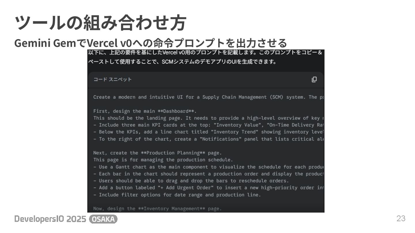 ツールの組み合わせ⽅ 23 Gemini GemでVercel v0への命令プロンプトを出⼒させる