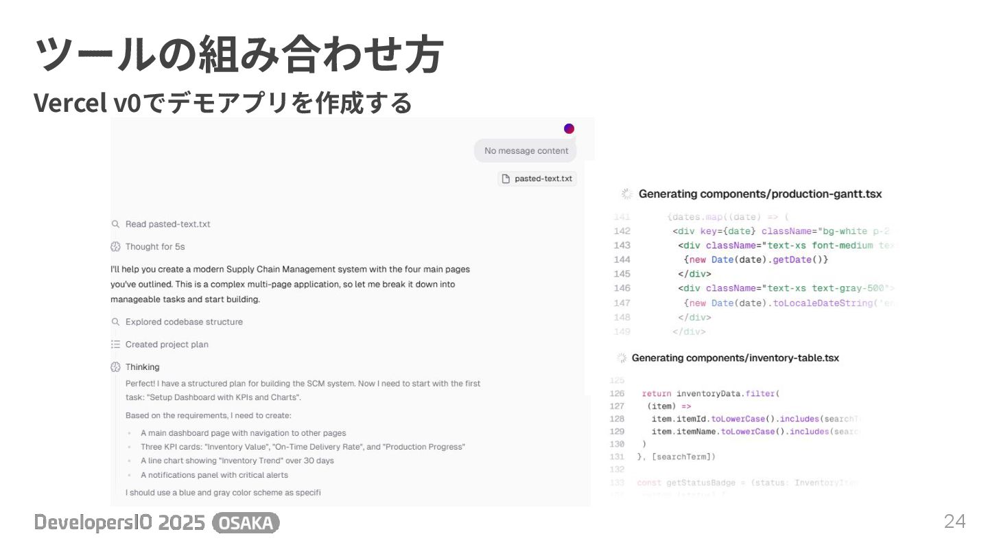 ツールの組み合わせ⽅ 24 Vercel v0でデモアプリを作成する