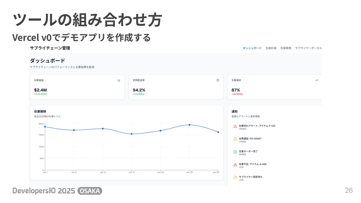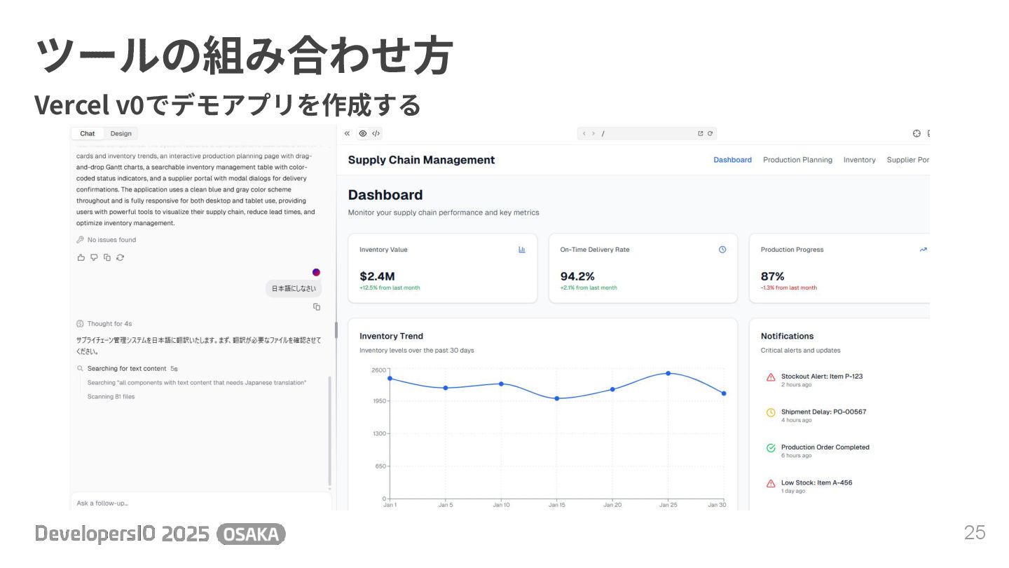 ツールの組み合わせ⽅ 25 Vercel v0でデモアプリを作成する