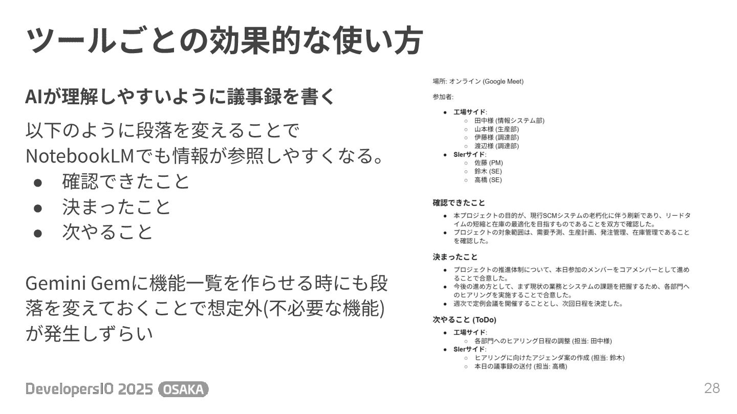 ツールごとの効果的な使い⽅ 28 AIが理解しやすいように議事録を書く 以下のように段落を変えることで NotebookLMでも情報が参照しやすくなる。 • 確認できたこと • 決まったこと •