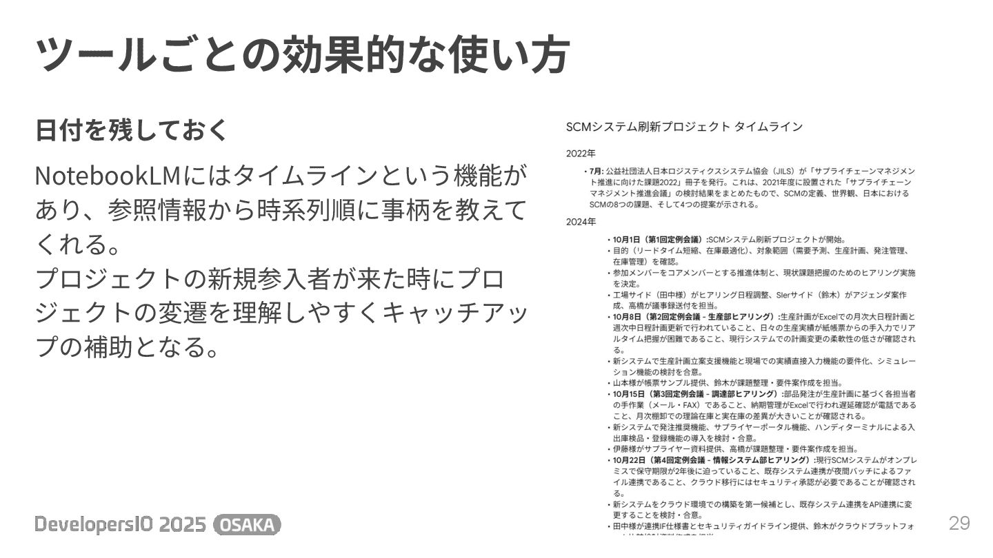 ツールごとの効果的な使い⽅ 29 ⽇付を残しておく NotebookLMにはタイムラインという機能が あり、参照情報から時系列順に事柄を教えて くれる。 プロジェクトの新規参⼊者が来た時にプロ ジェクトの変遷を理解しやすくキャッチアッ プの補助となる。