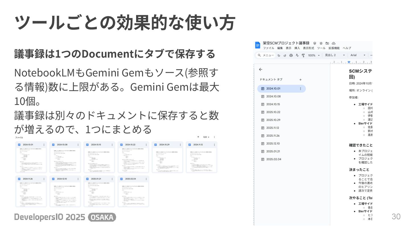 ツールごとの効果的な使い⽅ 30 議事録は1つのDocumentにタブで保存する NotebookLMもGemini Gemもソース(参照す る情報)数に上限がある。Gemini Gemは最⼤ 10個。 議事録は別々のドキュメントに保存すると数 が増えるので、1つにまとめる